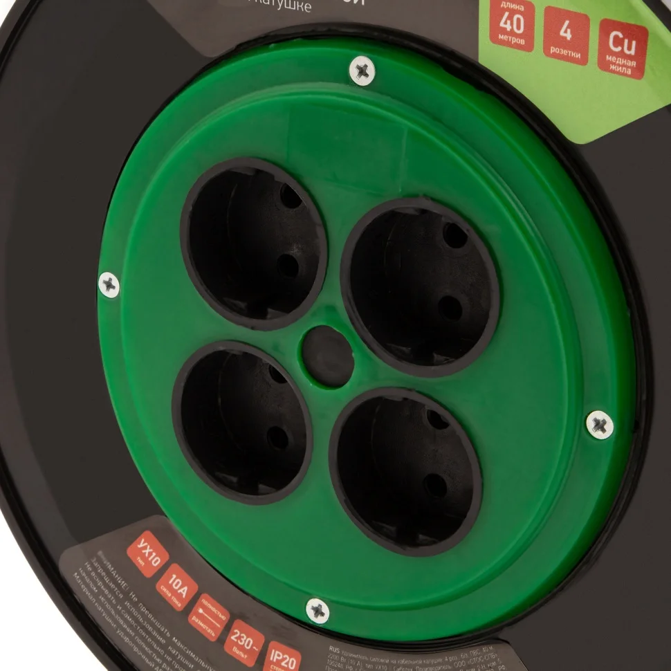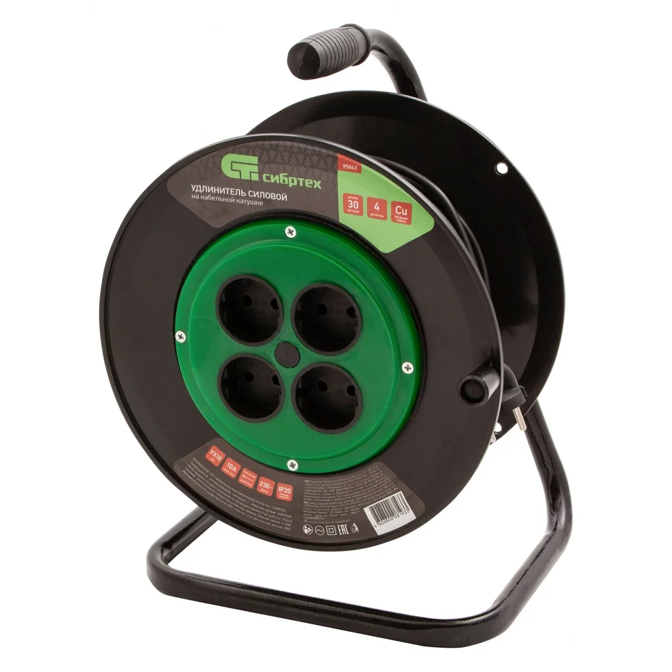 Силовой удлинитель на кабельной катушке Сибртех 95843, тип УХ10, 10 А, с кабелем ПВС длиной 30 м и 4 розетками без заземления, предназначен для подключения к удаленному источнику питания электроприборов суммарной мощностью не более 2200 Вт. Благодаря полой металлической стойке изделие весит всего 2 кг и его легко переносить. Для удобства разматывания и сматывания кабеля предусмотрена специальная ручка. Сетевой удлинитель пригодится на строительной площадке, в автомастерской, а также на дачном участке.ПреимуществаКатушка из гибкого ударопрочного пластика рассчитана на длительное использование.Кабель в двойной оболочке из ПВХ устойчив к механическим повреждениям.Прорезиненная рукоятка обеспечивает безопасность пользователя в случае повреждения кабеля.Сертификат соответствия требованиям ТР ТС 004/2011 подтверждает высокое качество удлинителя.