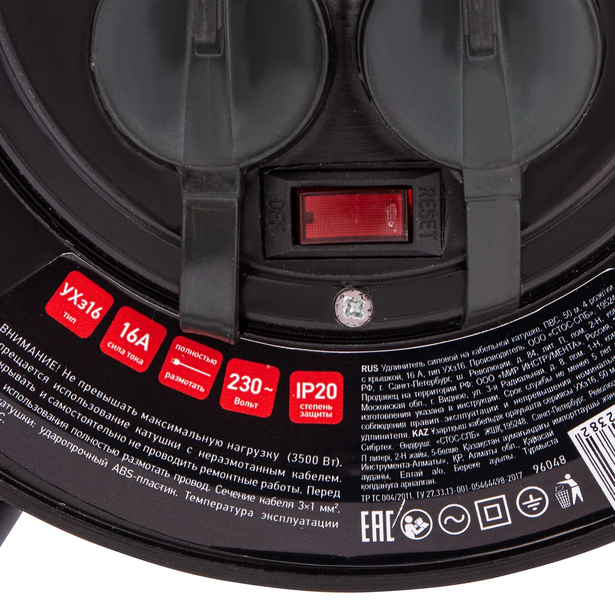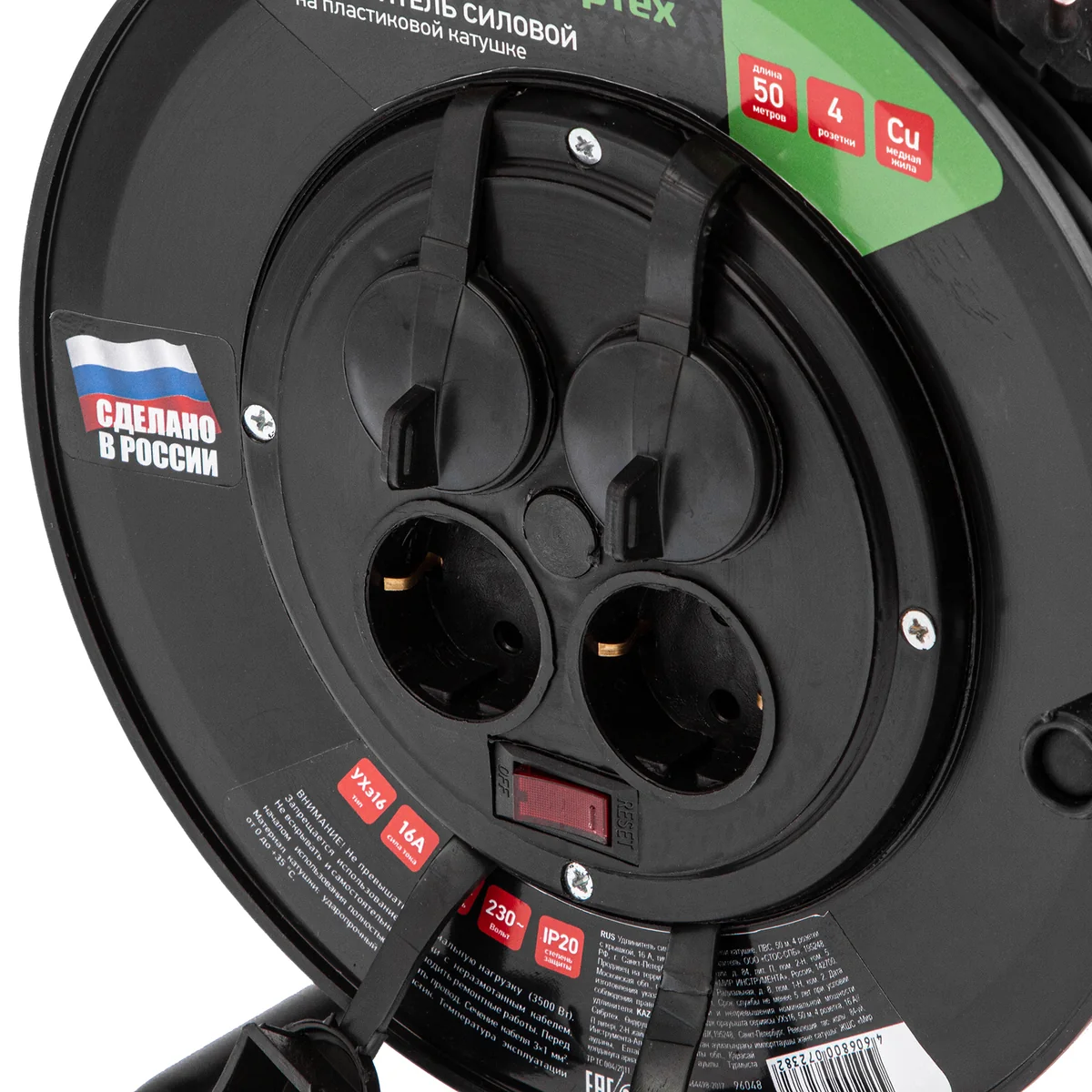Силовой удлинитель на кабельной катушке Сибртех 96048 типа УХз16, 16 А, степень защиты IP44, имеет 4 розетки с крышкой для подключения различного электрооборудования суммарной мощностью 3500 Вт, используемого на расстоянии до 50 м от стационарного источника питания. Удобная ручка облегчает разматывание и сматывание кабеля. Заземляющие контакты розеток предотвращают поражение пользователя электрическим током. Розетки закрываются крышками, защищающими разъемы от попадания влаги и грязи. Сетевой удлинитель пригодится для работы с инструментом на строительной площадке или дачном участке.Преимущества Полая внутри металлическая стойка не утяжеляет конструкцию — удлинитель удобно переносить. Корпус выполнен из гибкого ударопрочного пластика, поэтому изделие прослужит долго. На корпусе имеется выключатель, что упрощает эксплуатацию удлинителя. Рукоятка обрезинена, что уменьшает риск получения электротравмы в случае повреждения кабеля. Кабель имеет двойную оболочку из ПВХ, обеспечивающую ему устойчивость к механическим повреждениям. Удлинитель имеет класс защиты IP44, поэтому его можно использовать в условиях высокой влажности. Характеристики удлинителя соответствуют требованиям ТР ТС 004/2011, что подтверждает его надежность.