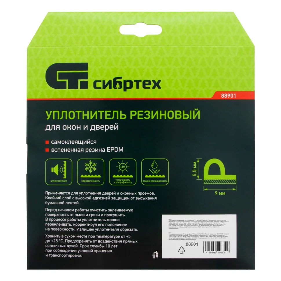 Белый резиновый уплотнитель Сибртех 88901 длиной 24 м, профиль «Р», предназначен для герметизации и уплотнения оконных и дверных блоков с целью исключения сквозняков и вибраций, защиты от влаги и пыли, создания эффективной тепло- и звукоизоляции. Изделие снижает энергетические и экономические затраты. P профиль 9 x 5,5 мм подойдет для щелей размером 3-5 мм.ПреимуществаИзготовлен из износостойкой вспененной резины EPDM.Легко восстанавливает форму после сжатия, не твердеет.Выдерживает большие колебания температуры.Имеет бумажный лайнер для защиты клейкого слоя с высокой адгезией от высыхания.Рассчитан на долгий срок службы.