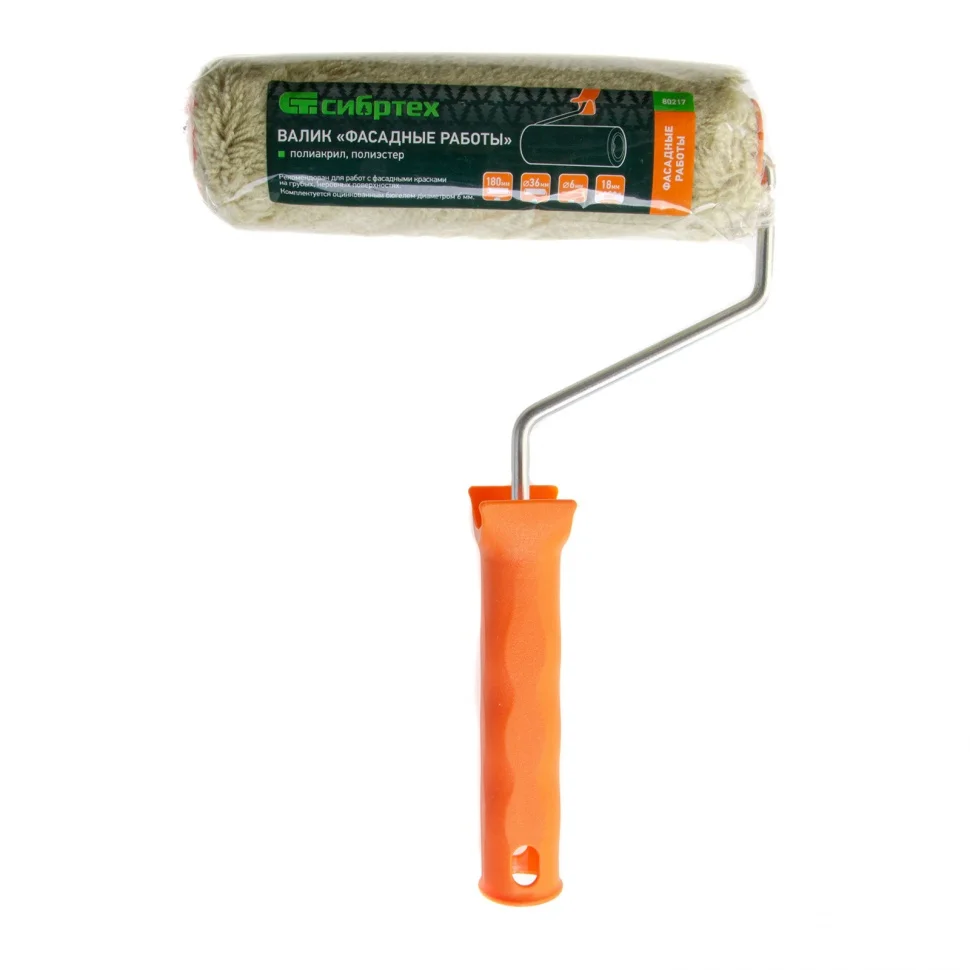 Валик Сибртех «Фасадные работы» 80217 с ворсом 18 мм из полиакрила и полиэстера, роликом 180 х 36 мм, ручкой 6 мм, рассчитан на наружные работы с фасадными красками. Валик эффективен для обработки поверхностей с грубой фактурой и неровностями. Полиакрил в составе шубки повышает ее формостойкость и устойчивость к разрывным нагрузкам.ПреимуществаДолговечность — благодаря новейшей технологии изготовления Termofusion Coinjection валик отличается высоким ресурсом и износостойкостью.Быстрая очистка и замена — валик классической конструкции с трубкой внутри устанавливается и снимается за несколько секунд.Равномерное нанесение лакокрасочных материалов — края валика обработаны, и на нем нет шва.Прочность — шубка не отклеивается от ролика, т.к. закреплена термическим методом.Защита от воздействия влаги — бюгель оцинкован, что предотвращает образование коррозии.Ширина 180 мм — валик позволяет быстро окрашивать большие участки.Комфортная работа — свободно вращающийся ролик не заедает во время окрашивания, что повышает отдачу ЛКМ и уменьшает усталость мастера.