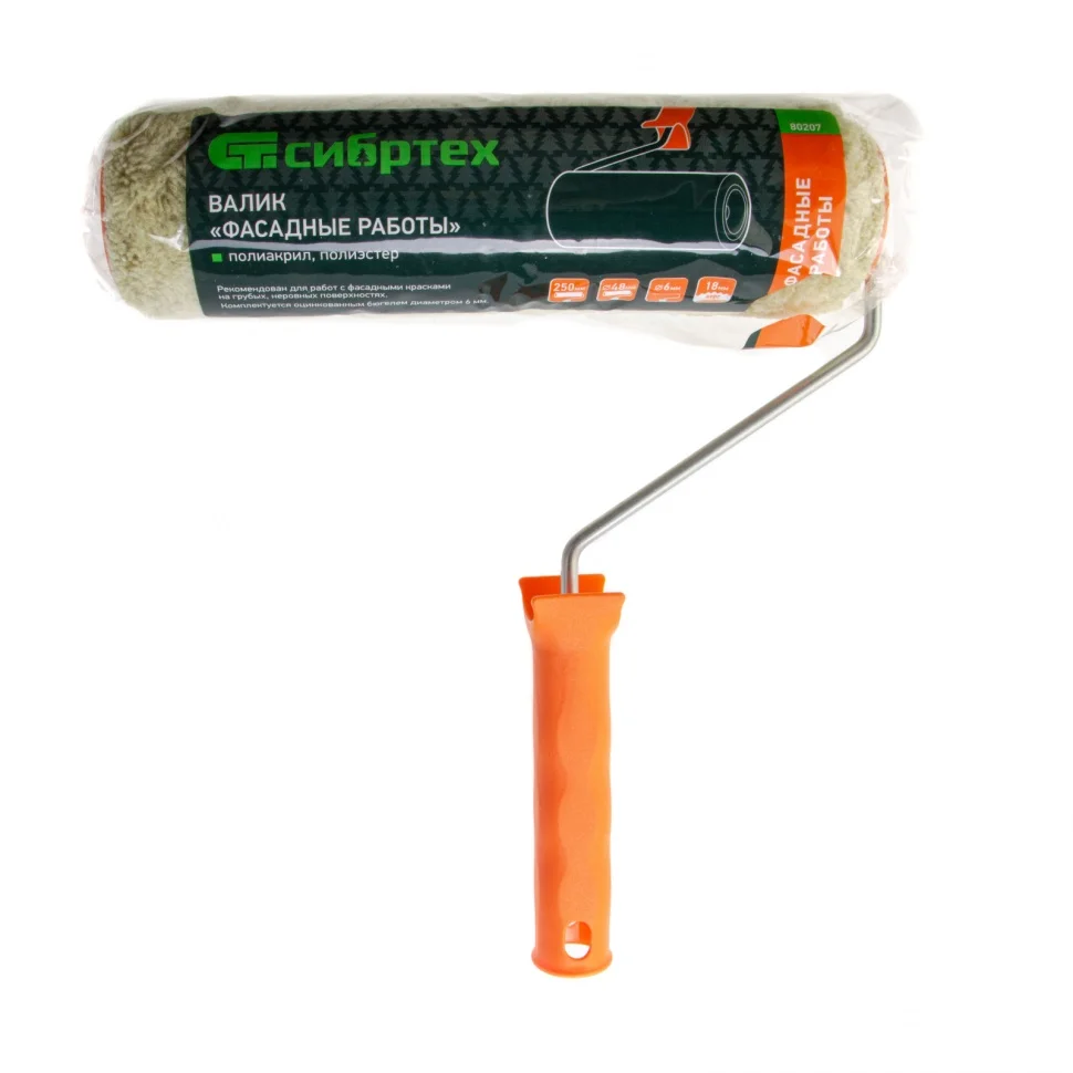 Валик Сибртех «Фасадные работы» 80207 с ворсом 18 мм из полиакрила и полиэстера, роликом 250 х 48 мм, ручкой 6 мм, рассчитан на наружные работы с фасадными красками. Валик эффективен для обработки поверхностей с грубой фактурой и неровностями. Полиакрил в составе шубки повышает ее формостойкость и устойчивость к разрывным нагрузкам.ПреимуществаДолговечность — благодаря новейшей технологии изготовления Termofusion Coinjection валик отличается высоким ресурсом и износостойкостью.Быстрая очистка и замена — валик классической конструкции с трубкой внутри устанавливается и снимается за несколько секунд.Равномерное нанесение лакокрасочных материалов — края валика обработаны, и на нем нет шва.Прочность — шубка не отклеивается от ролика, т.к. закреплена термическим методом.Защита от воздействия влаги — бюгель оцинкован, что предотвращает образование коррозии.Ширина 250 мм — валик позволяет быстро окрашивать большие участки.Комфортная работа — свободно вращающийся ролик не заедает во время окрашивания, что повышает отдачу ЛКМ и уменьшает усталость мастера.