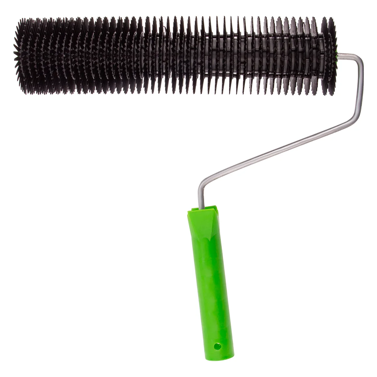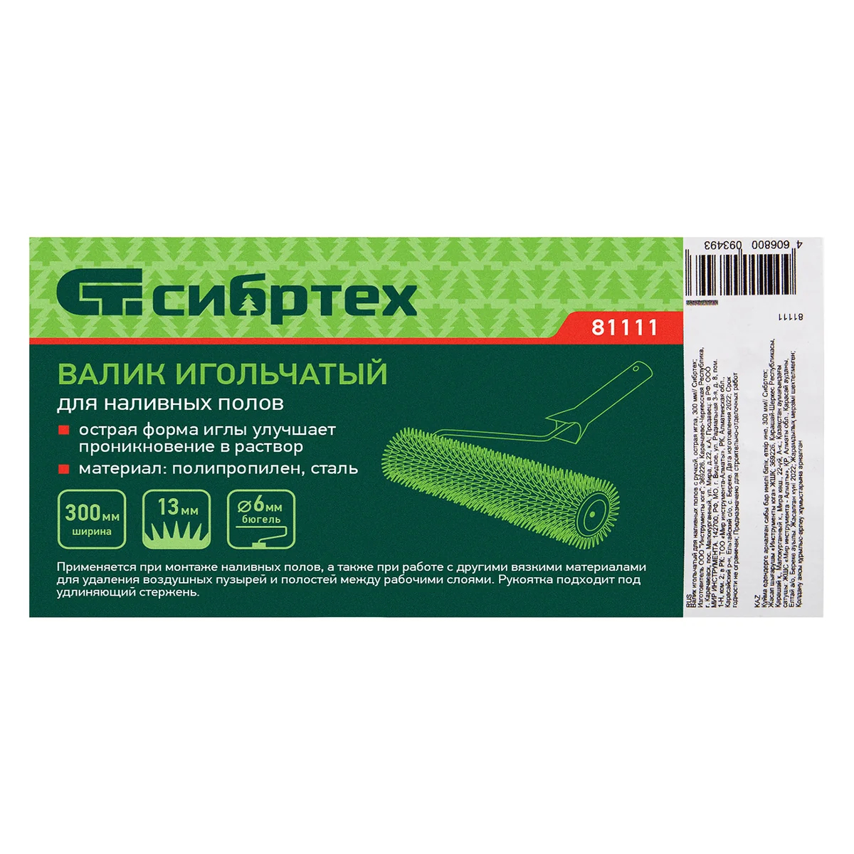 Валик игольчатый Сибртех 81110 с ручкой, длина 240 мм, применяется при монтаже наливных полов, а также при работе с другими вязкими материалами для удаления воздушных пузырей и полостей между рабочими слоями. Иголки длиной 14 мм подходят для покрытий небольшой толщины.Преимущества Иглы за счет острой формы глубже проникают в раствор, что обеспечивает эффективность работы. Рукоятка подходит под удлиняющий стержень. Валик легко отмывается от раствора, поэтому уход за ним очень простой.