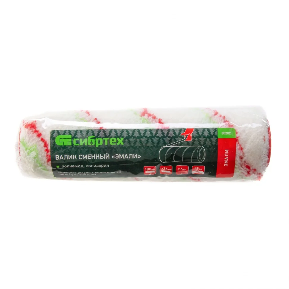 Сменный валик Сибртех «Эмали» 80202 с ворсом 12 мм из полиамида и полиакрила, размером ролика 180 х 36 мм, под ручку 6 мм, подходит для проведения малярных работ с любыми типами лакокрасочных материалов, даже содержащих агрессивные вещества. За счет ворса средней длины подходит для поверхностей любого типа. Рекомендован для работ с эмалями.ПреимуществаЭффективная работа — валик хорошо прокрашивает даже неровные поверхности, не оставляя ворса.Прочность и износостойкость — шубка с добавлением полиамидного волокна надежно зафиксирована на ролике термическим методом.Быстросъемная конструкция — ролик легко снимается для очистки и замены, что экономит время мастера.Равномерное нанесение краски — шубка выполнена без шва, а ее края обработаны, поэтому валик не оставляет следов на окрашиваемой поверхности.Ширина 180 мм — валик позволяет быстро окрашивать большие участки.Высококачественное исполнение — применение новейшей технологии Termofusion Coinjection при производстве валика позволяет увеличить срок его службы и обеспечивает эффективное окрашивание.