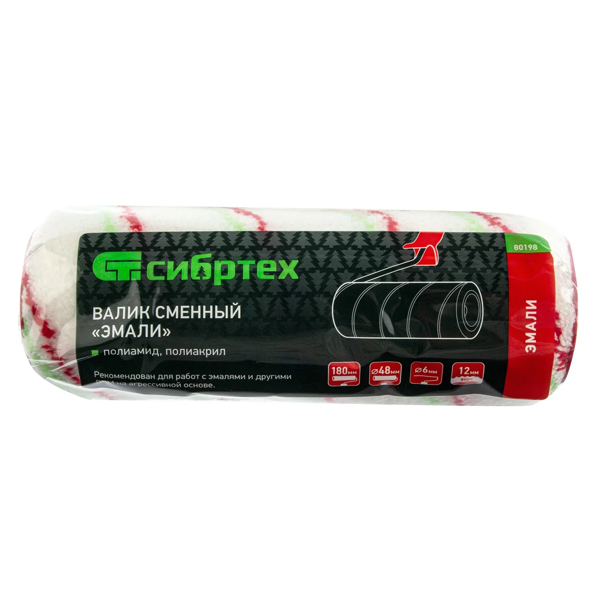 Сменный валик Сибртех «Эмали» 80198 с ворсом 12 мм из полиамида и полиакрила, размером ролика 180 х 48 мм, под ручку 6 мм, подходит для проведения малярных работ с любыми типами лакокрасочных материалов, даже содержащих агрессивные вещества. За счет ворса средней длины подходит для поверхностей любого типа. Рекомендован для работ с эмалями.ПреимуществаЭффективная работа — валик хорошо прокрашивает даже неровные поверхности, не оставляя ворса.Прочность и износостойкость — шубка с добавлением полиамидного волокна надежно зафиксирована на ролике термическим методом.Быстросъемная конструкция — ролик легко снимается для очистки и замены, что экономит время мастера.Равномерное нанесение краски — шубка выполнена без шва, а ее края обработаны, поэтому валик не оставляет следов на окрашиваемой поверхности.Ширина 180 мм — валик позволяет быстро окрашивать большие участки.Высококачественное исполнение — применение новейшей технологии Termofusion Coinjection при производстве валика позволяет увеличить срок его службы и обеспечивает эффективное окрашивание.
