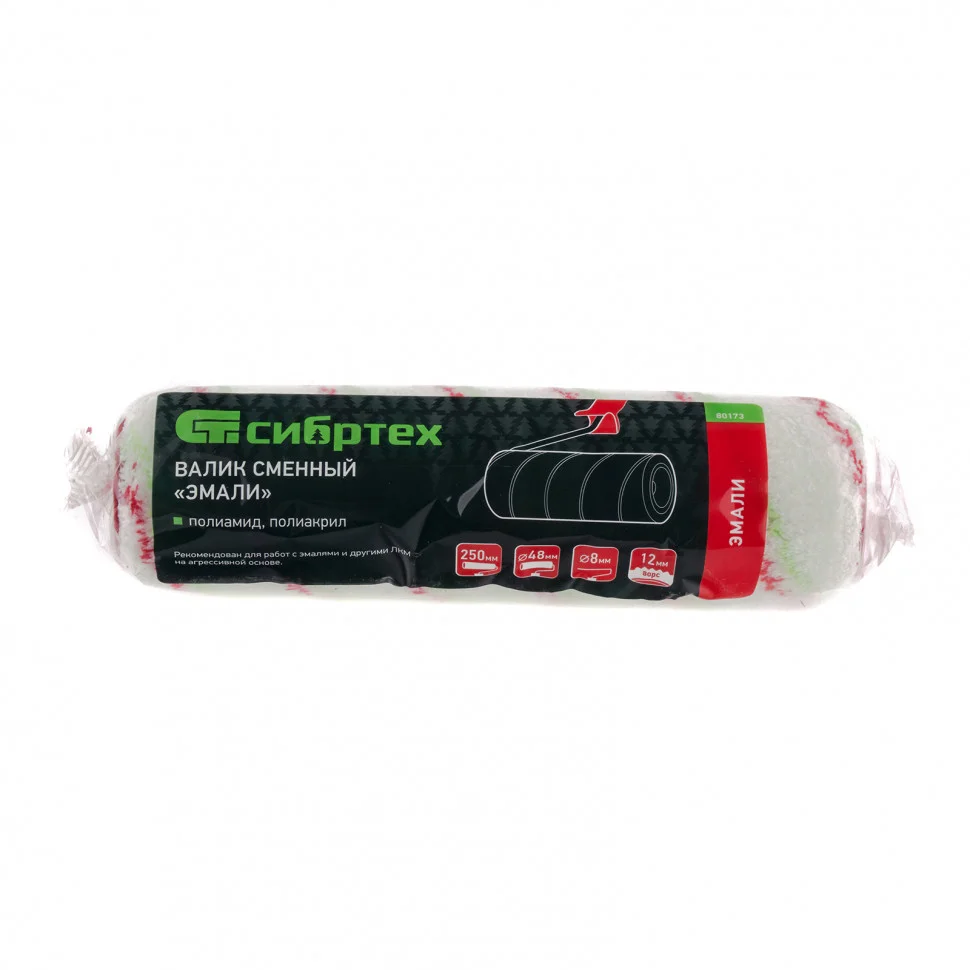 Сменный валик Сибртех «Эмали» 80173 с ворсом 12 мм из полиамида и полиакрила, размером ролика 250 х 48 мм, под ручку 8 мм, подходит для проведения малярных работ с любыми типами лакокрасочных материалов, даже содержащих агрессивные вещества. За счет ворса средней длины подходит для поверхностей любого типа. Рекомендован для работ с эмалями.ПреимуществаЭффективная работа — валик хорошо прокрашивает даже неровные поверхности, не оставляя ворса.Прочность и износостойкость — шубка с добавлением полиамидного волокна надежно зафиксирована на ролике термическим методом.Быстросъемная конструкция — ролик легко снимается для очистки и замены, что экономит время мастера.Равномерное нанесение краски — шубка выполнена без шва, а ее края обработаны, поэтому валик не оставляет следов на окрашиваемой поверхности.Ширина 250 мм — валик позволяет быстро окрашивать большие участки.Высококачественное исполнение — применение новейшей технологии Termofusion Coinjection при производстве валика позволяет увеличить срок его службы и обеспечивает эффективное окрашивание.