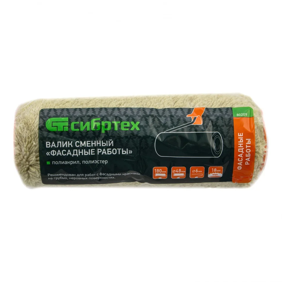 Сменный валик Сибртех «Фасадные работы» 80209 с ворсом 18 мм из полиакрила и полиэстера, роликом 180 х 48 мм, предназначен для установки на ручку диаметром 6 мм. Его используют при проведении фасадных работ для нанесения ЛКМ на грубые участки с неровностями.ПреимуществаПрочность — сочетание полиакрила и полиэстера обеспечивает повышенную устойчивость валика к износу и разрывным нагрузкам, позволяет работать с любыми типами ЛКМ.Надежность — термически приклеенная шубка не отслаивается от ролика.Высокая скорость работы — валик шириной 180 мм оптимален для больших площадей.Увеличенный ресурс и улучшенное качество покрытия — валик изготовлен с использованием новейшей технологии Termofusion Coinjection.Быстрая подготовка к работе — валик легко устанавливается на бюгель благодаря классической конструкции с внутренней трубкой.Высокое качество окрашивания — валик не оставляет следов на поверхности, т.к. имеет бесшовную структуру и обработанные края.