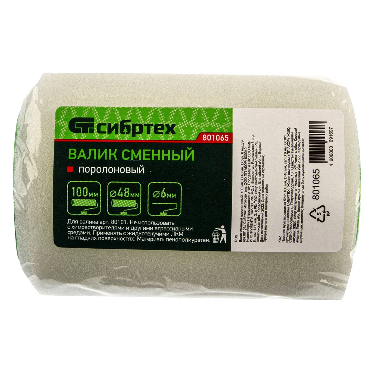 Поролоновый сменный валик Сибртех 801065 шириной 100 мм и диаметром 48мм используется в качестве сменного для валика Сибртех 80101. Он предназначен для покрытия гладких поверхностей невязкими водно-дисперсионными красками, например, латексными и акриловыми, а также пропитками, водно-клеевыми составами и грунтовкой. Шубка из поролона отлично впитывает лакокрасочные материалы, обеспечивая высокую производительность работы. Не рекомендуется использование поролоновых валиков с ЛКМ содержащими в составе едкие химические элементы.ПреимуществаБлагодаря сменному ролику валик Сибртех 80101 можно использовать многократно.Бесшовная структура шубки обеспечивает равномерное нанесение краски и не оставляет следов на поверхности.Ширина 100 мм оптимально подходит для работы в труднодоступных местах.