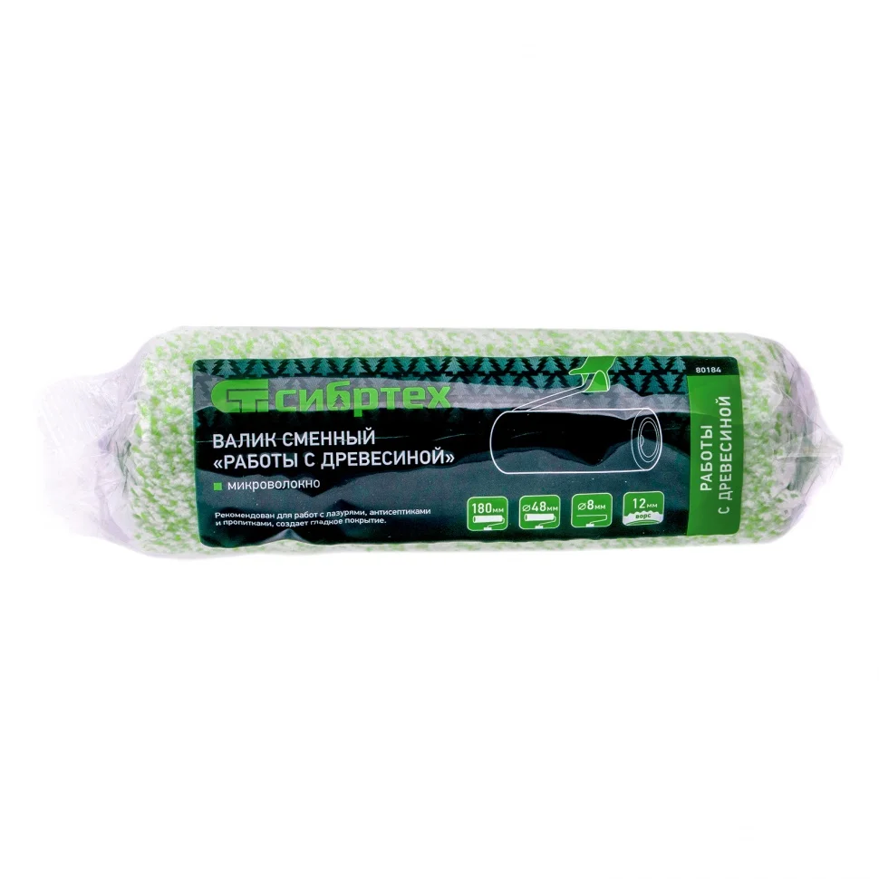 Сменный валик Сибртех «Работы с древесиной» 80184 шириной 180 мм, с ворсом 12 мм из микроволокна, диаметром 48 мм, подходит под ручку 8 мм. Он равномерно наносит на деревянный поверхности жидкие ЛКМ: антисептики, грунтовки, пропитки, защитные составы, лазурь и другие невязкие материалы. За счет ширины 180 мм валик оптимален для окрашивания больших поверхностей.ПреимуществаЭффективная работа — шубка из микроволокна отлично впитывает лакокрасочные материалы и позволяет наносить их ровным тонким слоем.Быстрая установка — валик имеет классическую конструкцию с внутренней трубкой, поэтому подготовка к работе не займет много времени.Равномерное окрашивание — шубка выполнена без швов, а ее края аккуратно острижены, поэтому валик не оставляет следов на поверхности.Высокий ресурс — термически приклеенная шубка не соскальзывает и не отслаивается от ролика, поэтому валик выдерживает многократное использование.Высокое качество — валик изготовлен с применением новейшей технологии Termofusion Coinjection.