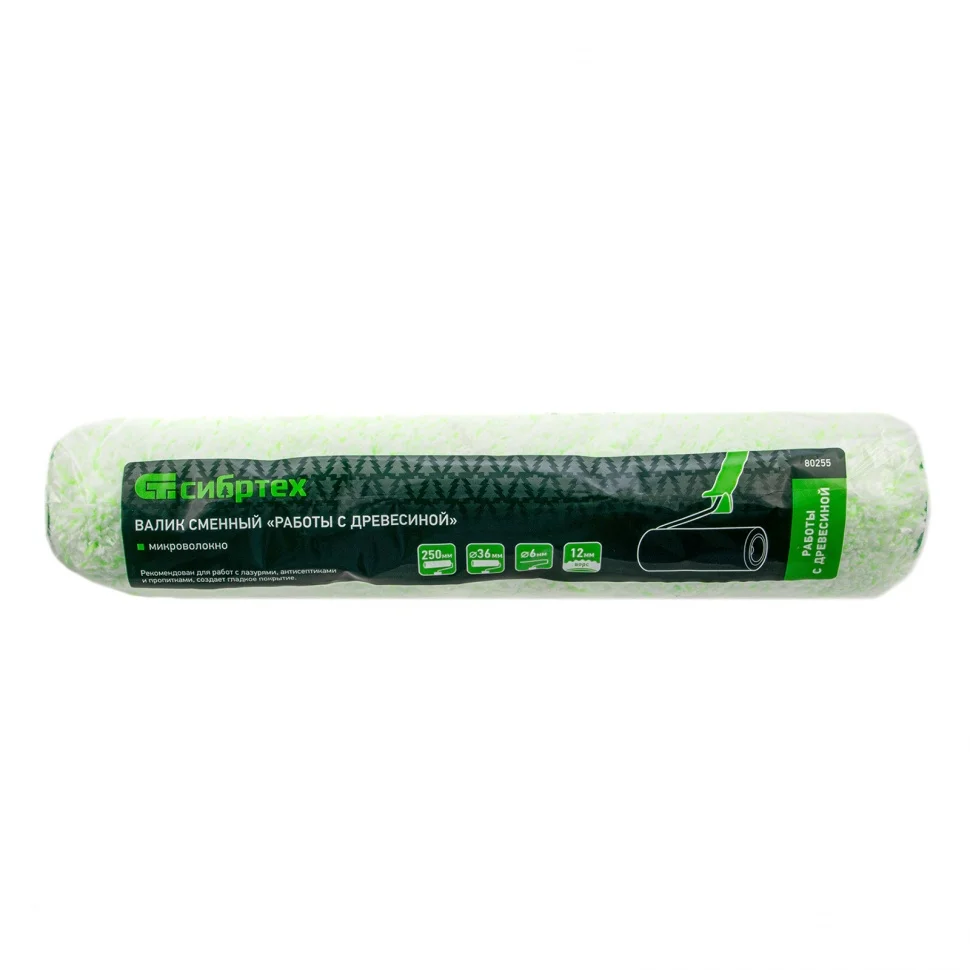 Сменный валик Сибртех «Работы с древесиной» 80255 шириной 250 мм, с ворсом 12 мм из микроволокна, диаметром 36 мм, подходит под ручку 6 мм. Он равномерно наносит на деревянный поверхности жидкие ЛКМ: антисептики, грунтовки, пропитки, защитные составы, лазурь и другие невязкие материалы. За счет ширины 250 мм валик оптимален для окрашивания больших поверхностей.ПреимуществаЭффективная работа — шубка из микроволокна отлично впитывает лакокрасочные материалы и позволяет наносить их ровным тонким слоем.Быстрая установка — валик имеет классическую конструкцию с внутренней трубкой, поэтому подготовка к работе не займет много времени.Равномерное окрашивание — шубка выполнена без швов, а ее края аккуратно острижены, поэтому валик не оставляет следов на поверхности.Высокий ресурс — термически приклеенная шубка не соскальзывает и не отслаивается от ролика, поэтому валик выдерживает многократное использование.Высокое качество — валик изготовлен с применением новейшей технологии Termofusion Coinjection.