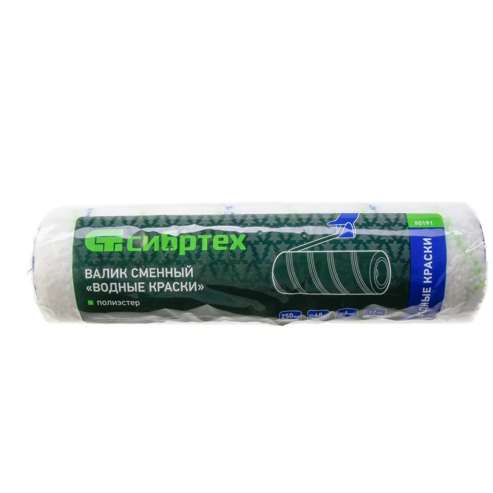 Сменный валик Сибртех «Водные краски» 80191 250 х 48 мм, с ворсом 12 мм из полиэстера, устанавливается на ручку диаметром 6 мм. Оптимален для работы с водно-дисперсионными красками. Универсальная длина ворса 12 мм подходит для окрашивания большинства типов поверхностей.ПреимуществаНовейшая технология производства Termofusion Coinjection — ресурс валика и качество окрашивания увеличены в несколько раз.Высокое качество окрашивания — шубка без шва, с обработанными краями, не оставляет следов на поверхности.Прочность — термически приклеенная шубка не оторвется от валика даже при интенсивной эксплуатации.Свободное вращение — ролик не заедает в процессе работы, обеспечивая наибольший коэффициент отдачи краски.Ширина 250 мм — валик позволяет быстро окрашивать большие поверхности.