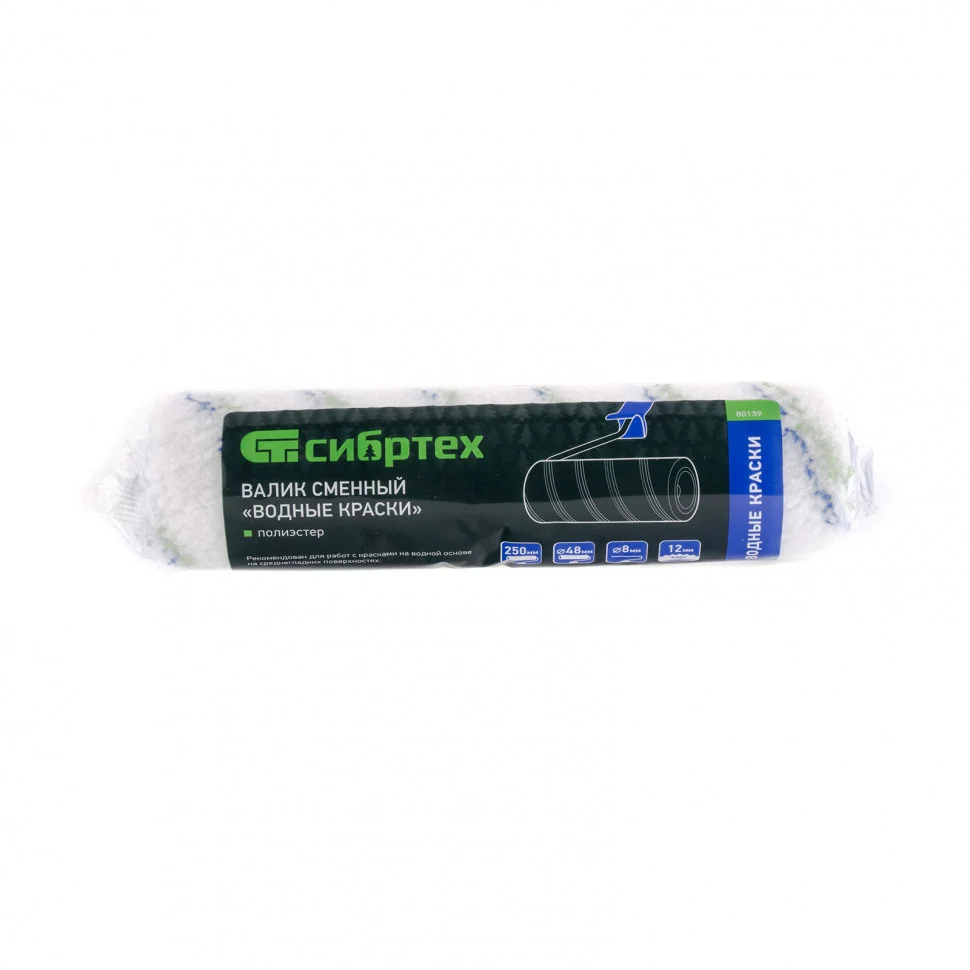 Сменный валик Сибртех «Водные краски» 80139 250 х 48 мм, с ворсом 12 мм из полиэстера, устанавливается на ручку диаметром 8 мм. Оптимален для работы с водно-дисперсионными красками. Универсальная длина ворса 12 мм подходит для окрашивания большинства типов поверхностей.ПреимуществаНовейшая технология производства Termofusion Coinjection — ресурс валика и качество окрашивания увеличены в несколько раз.Высокое качество окрашивания — шубка без шва, с обработанными краями, не оставляет следов на поверхности.Прочность — термически приклеенная шубка не оторвется от валика даже при интенсивной эксплуатации.Свободное вращение — ролик не заедает в процессе работы, обеспечивая наибольший коэффициент отдачи краски.Ширина 250 мм — валик позволяет быстро окрашивать большие поверхности.
