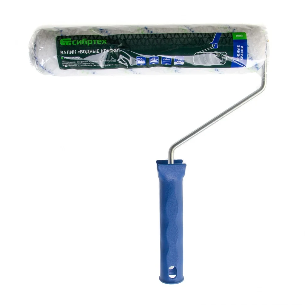 Валик Сибртех «Водные краски» 80193 с ворсом из полиэстера 12 мм, ручкой 6 мм и роликом 250 х 36 мм, используется для окрашивания поверхностей средней гладкости. Он оптимален для работы с красками на водной основе: латексными, акриловыми, силиконовыми и минеральными. Применяется для выполнения подготовительных и общих малярных работ.ПреимуществаИзносостойкость — валик изготовлен с использованием новейшей технологии Termofusion Coinjection.Высокое качество работ — края ролика обработаны, а шубка не имеет шва, поэтому валик не оставляет следов на поверхности.Возможность многократного использования — оцинкованный бюгель устойчив к коррозии, а термически приклеенная шубка не отслаивается от ролика.Комфортная работа — валик классической конструкции с трубкой внутри быстро снимается и устанавливается на бюгель, а свободно вращающийся ролик обеспечивает наибольший коэффициент отдачи краски.Ширина 250 мм — валик подходит для покраски больших поверхностей.