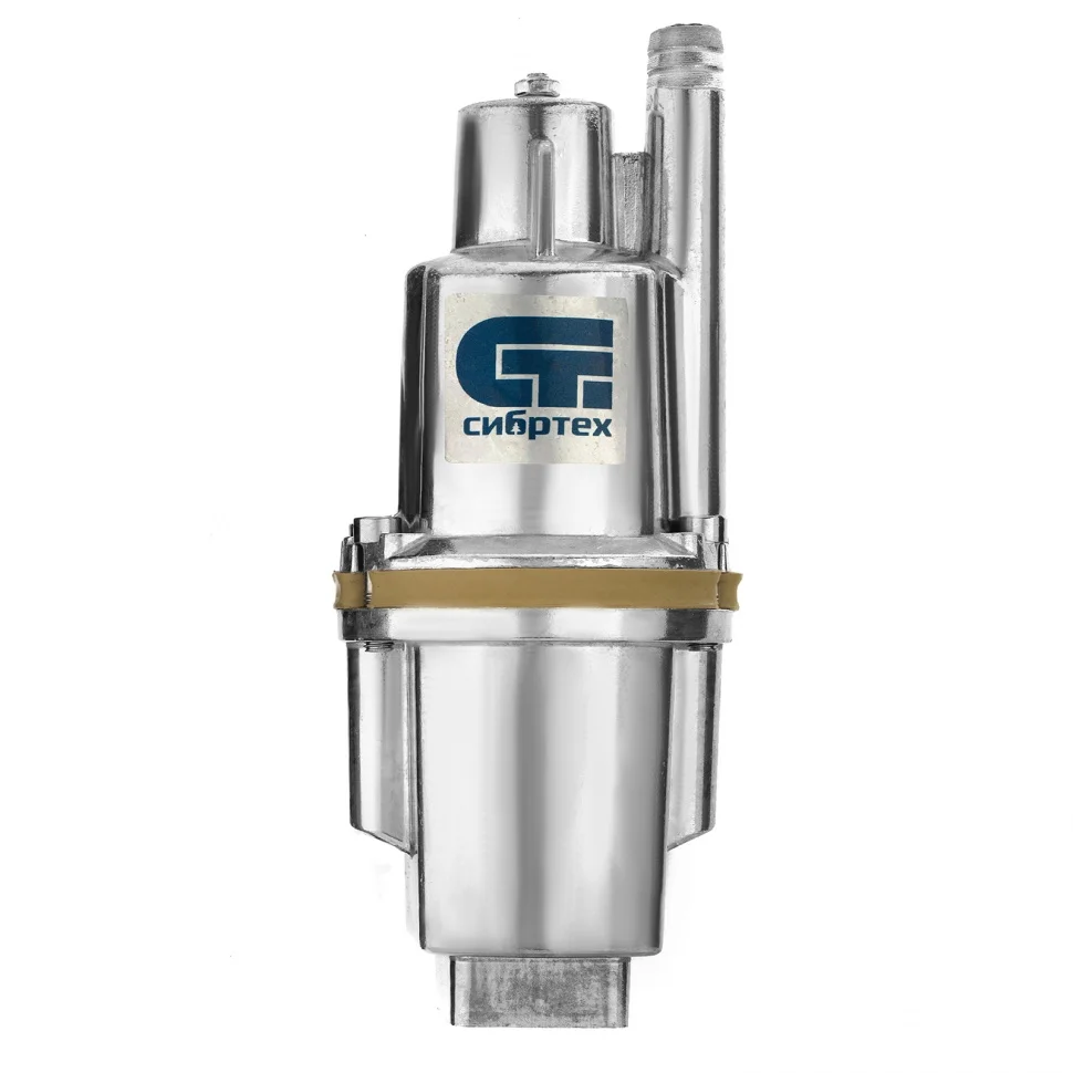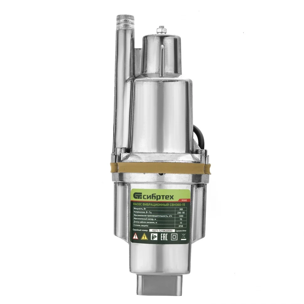 Вибрационный насос Сибртех СВН300-15 99302 мощностью 300 Вт, с кабелем длиной 15 м, способен поднимать чистую воду с глубины до 5 м из колодцев, резервуаров и водоемов со скоростью 1200 л/ч на высоту до 75 м. Используется для организации систем орошения и водоснабжения на даче, также с его помощью можно производить осушение подвалов, погребов, цокольных этажей. Напора и рабочего давления до 7,5 бар достаточно для подачи воды на 2-3 этаж.ПреимуществаПростой монтаж — с помощью троса, закрепленного в проушинах на корпусе, насос нужно опустить в колодец или резервуар и зафиксировать в вертикальном положении.Прочность — алюминиевый корпус устойчив к механическим повреждениям.Высокий ресурс — за счет системы верхнего забора воды двигатель не перегревается.Возможность подачи питьевой воды — мембрана изготовлена из пищевой резины, безвредной для здоровья.Надежная конструкция — детали корпуса скреплены болтами, поэтому даже при интенсивных вибрациях соединения не ослабляются.Герметичность — насос имеет степень защиты IPX8, поэтому вода не попадает на электронные компоненты.Удобный сетевой шнур — кабель длиной 15 м позволяет подключить насос к розетке вдали от воды.Минимальное обслуживание — при правильной эксплуатации не требуется залив воды, очистка фильтра, замена рабочих частей.Необходимые аксессуары в комплекте — трос для погружения и хомут для закрепления шланга прилагаются к насосу.Небольшой вес 3,6 кг — насос легко транспортировать и устанавливать.