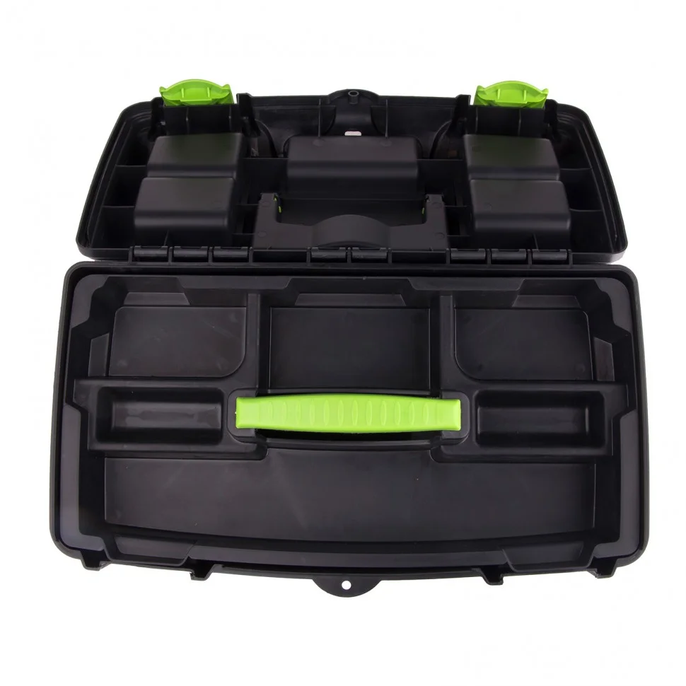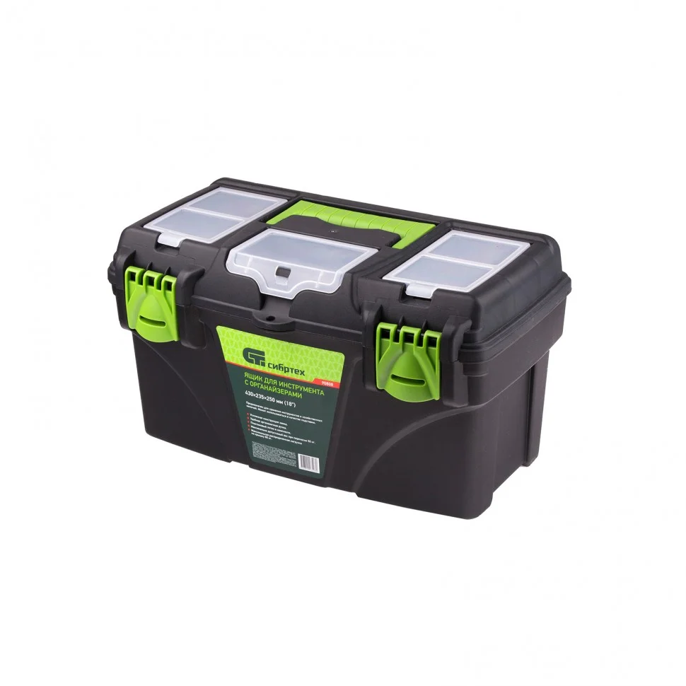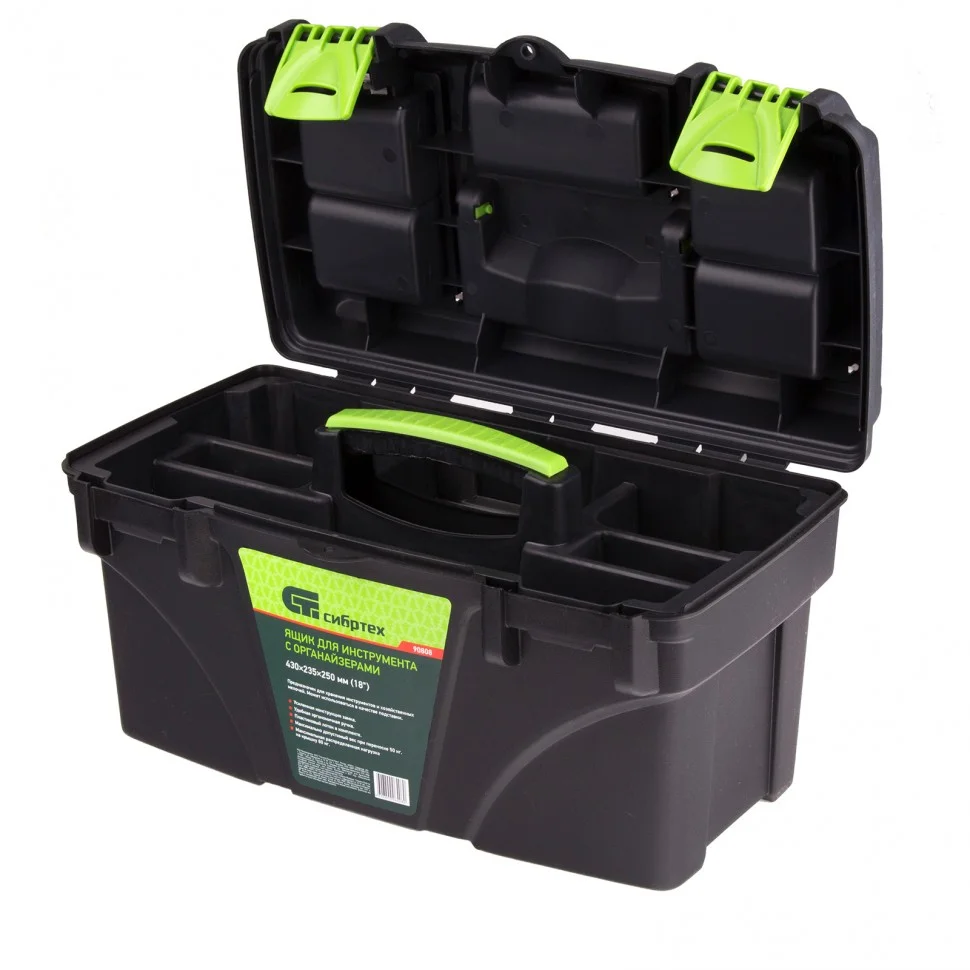 Ящик Сибртех 90808, 18 дюймов, с органайзерами, используется для хранения и транспортировки инструментов, оснастки, крепежей, хозяйственных мелочей и других предметов. Крышка и замок усилены трехрядными петлями, поэтому он выдерживает вес содержимого до 50 кг. Ящик можно брать в поездку, также он пригодится дома, на даче или в гараже.Преимущества В крышке предусмотрены органайзеры, в которых можно рассортировать крепежи и другие мелкие детали. Съемный лоток с ручкой позволяет оптимизировать пространство внутри ящика. Удобная ручка облегчает транспортировку даже максимально заполненного ящика. Ручка утапливается в крышке, поэтому при необходимости ящик может служить подставкой.