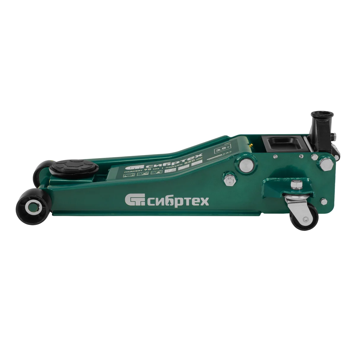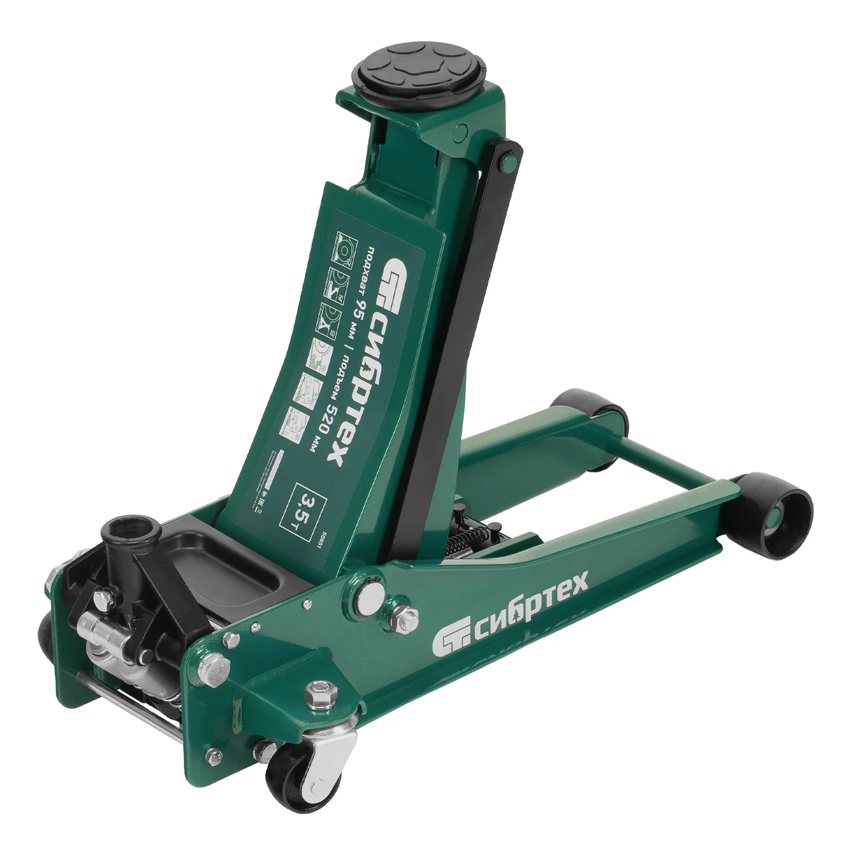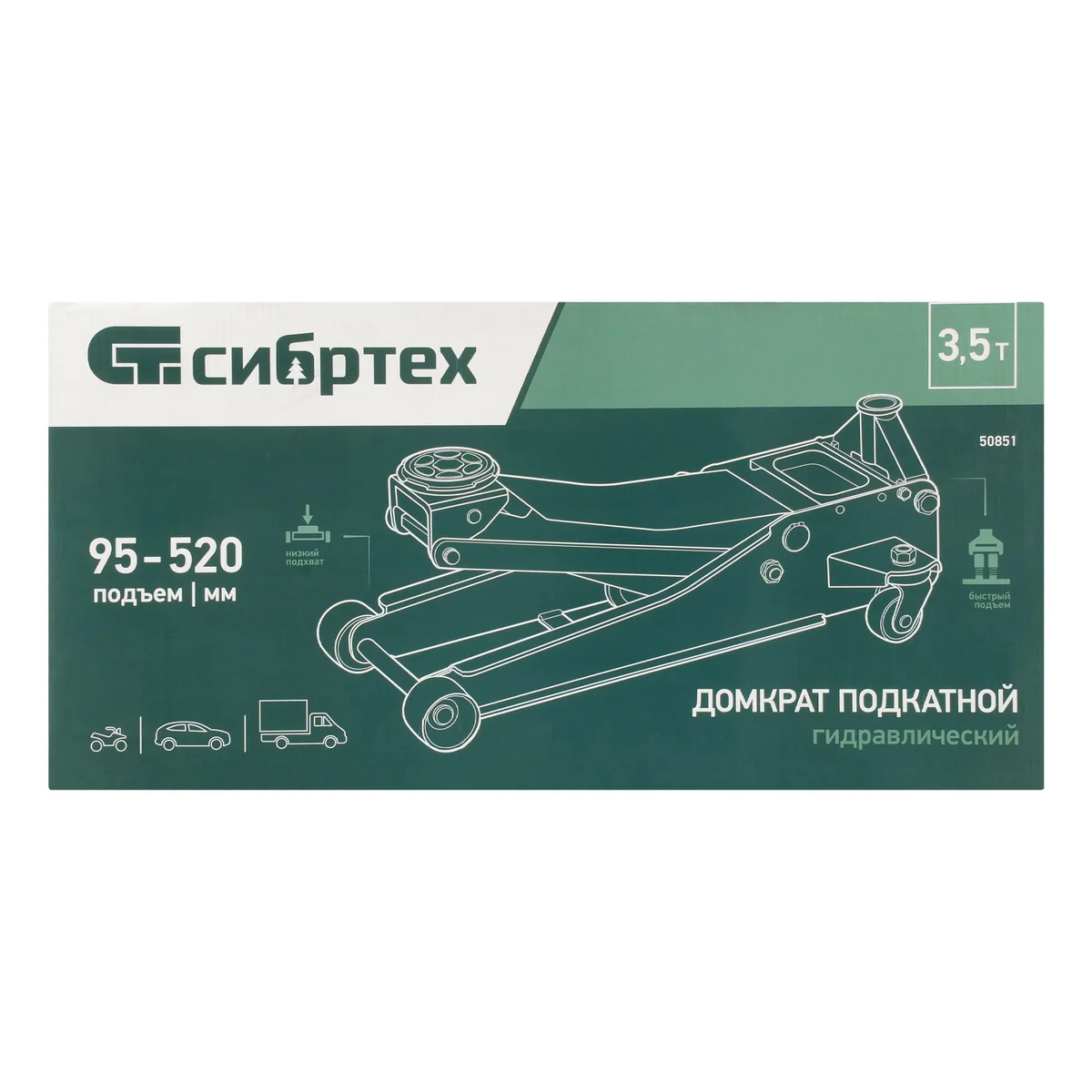 Гидравлический подкатной домкрат Сибртех 50851 с низким подхватом предназначен для быстрого подъема грузов массой 3,5 тонны на высоту с 95 до 520 мм. В гидравлическом блоке предусмотрено 2 насоса (система быстрого подъема QUICK LIFT), благодаря чему для достижения предельной высоты достаточно 6 качков рукоятки. Подходит для автомобилей с небольшим клиренсом, рекомендован для профессионального использования. Незаменим на предприятии автосервиса.