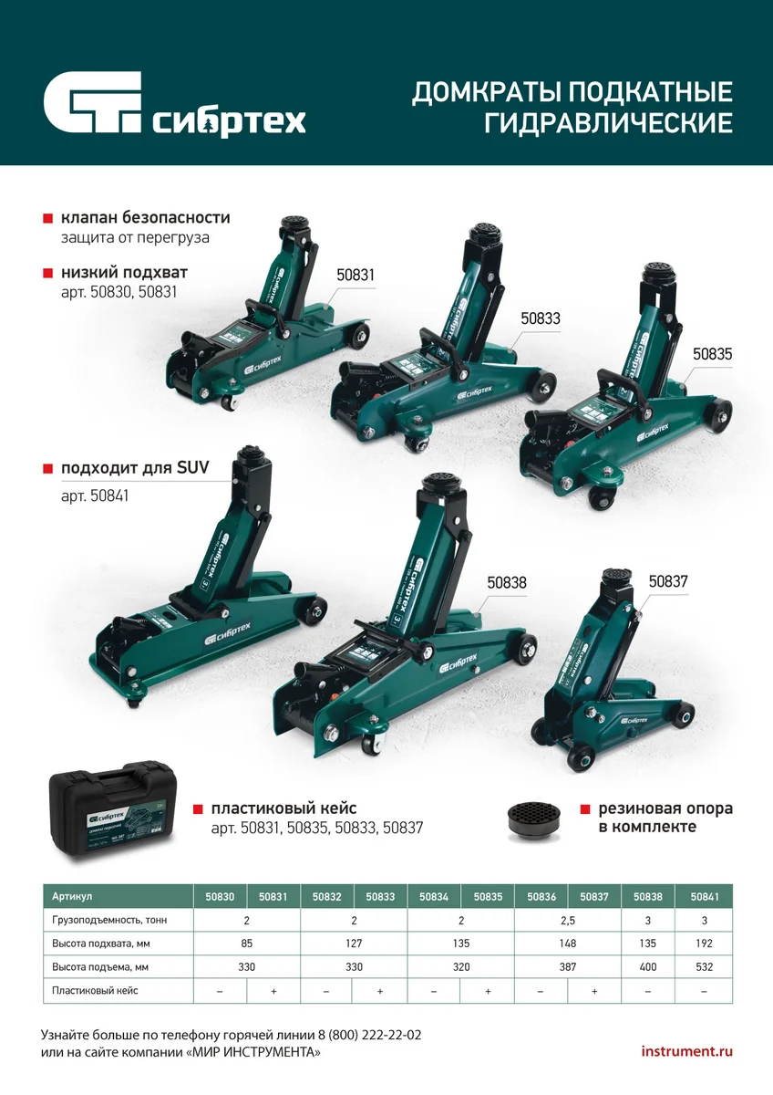 Гидравлический подкатной домкрат Сибртех 50831, поставляющийся в пластиковом кейсе, с высотой подхвата 85 мм, предназначен для подъема грузов массой до 2 т на высоту до 330 мм. Применяется для обслуживания автомобилей с низким клиренсом. Компактный домкрат подходит для самостоятельного использования автовладельцами.