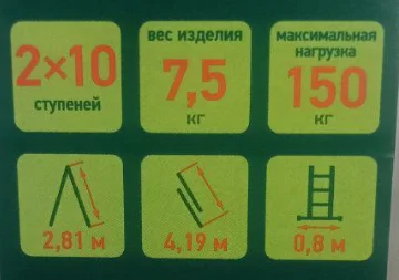 Алюминиевая двухсекционная лестница Сибртех 97910 состоит из 2-х секций по 10 ступеней каждая. Используется в качестве двухсторонней стремянки, предназначена для бытового и полупрофессионального применения.ПреимуществаРама выполнена из алюминиевого профиля прямоугольного сечения методом прессования, обладает легким весом и прочностью, способна выдержать нагрузку до 150 кг.Благодаря съемному стабилизатору лестница устойчиво стоит на горизонтальной поверхности.Напольное покрытие защищено от царапин пластиковыми заглушками.Противоскользящее рифление на профилированных ступенях и ограничители безопасности по максимальной высоте повышают безопасность пользователя.Лестница быстро собирается и разбирается, не занимает много места при хранении и транспортировке.