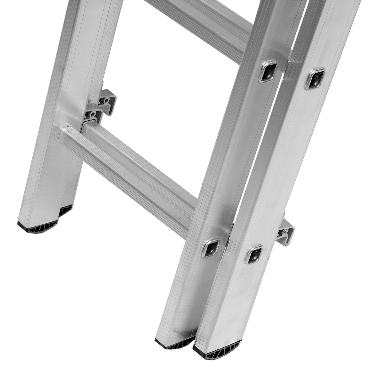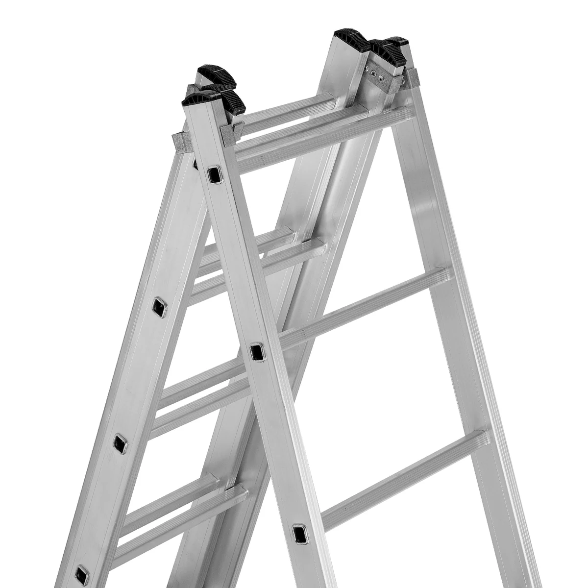 - Многофункциональность — лестница может использоваться в 3 различных вариациях — в качестве стремянки (с двумя расставленными и одной выдвинутой вверх секцией), двухсторонней стремянки (две секции расставлены, третья демонтирована) и приставной лестницы.