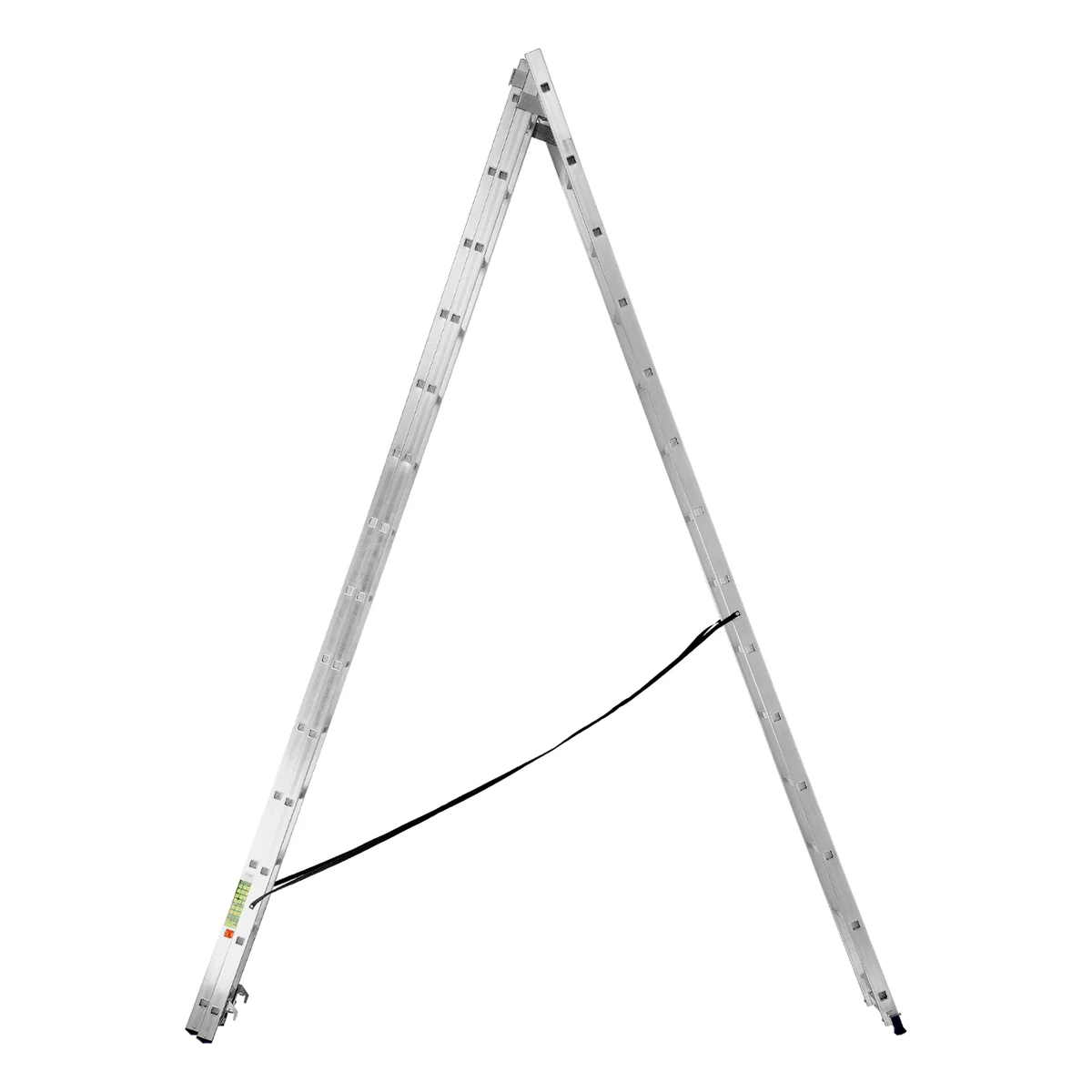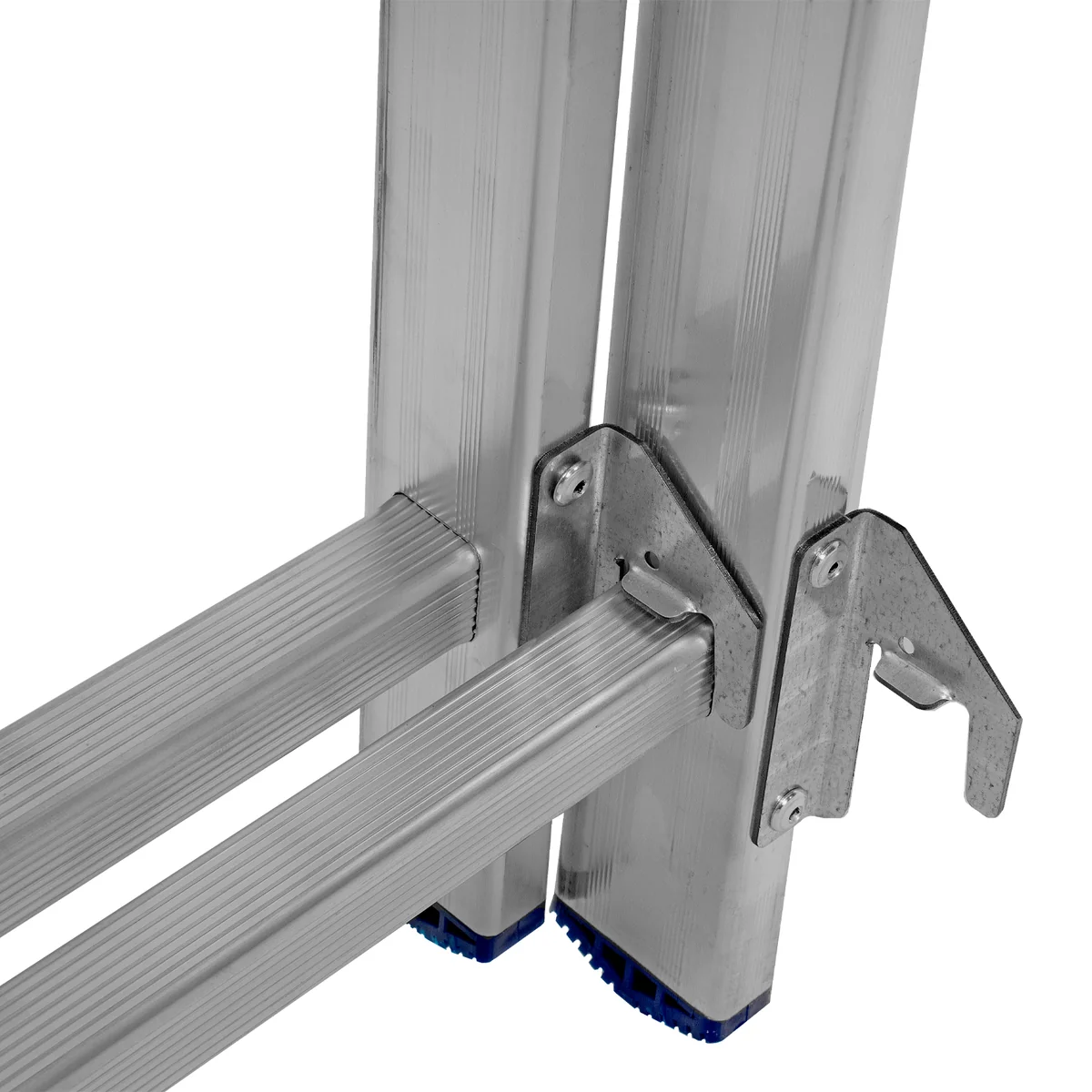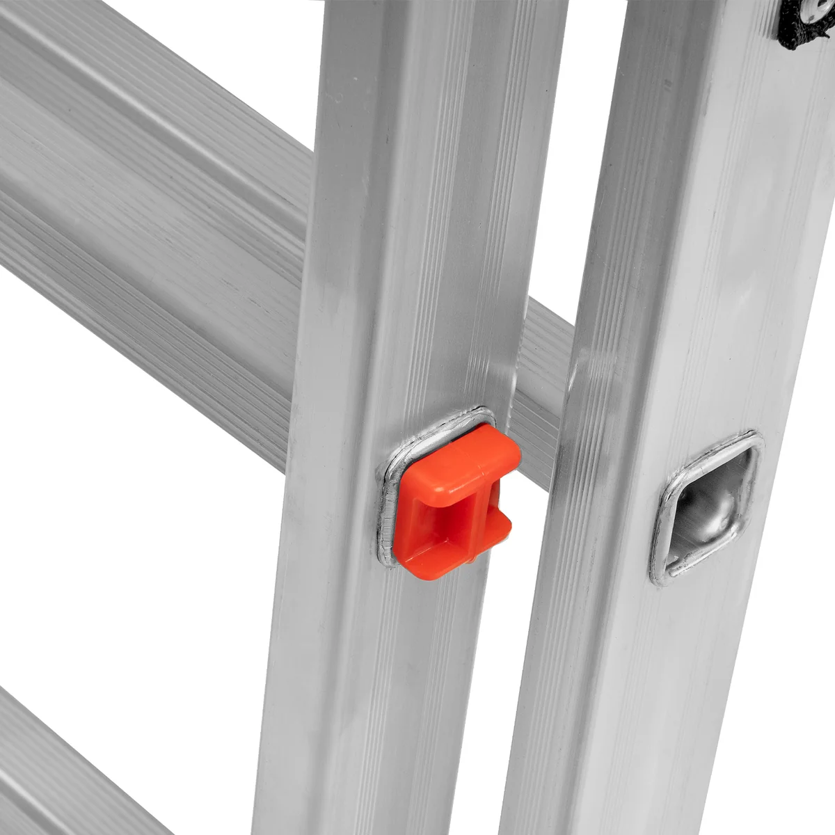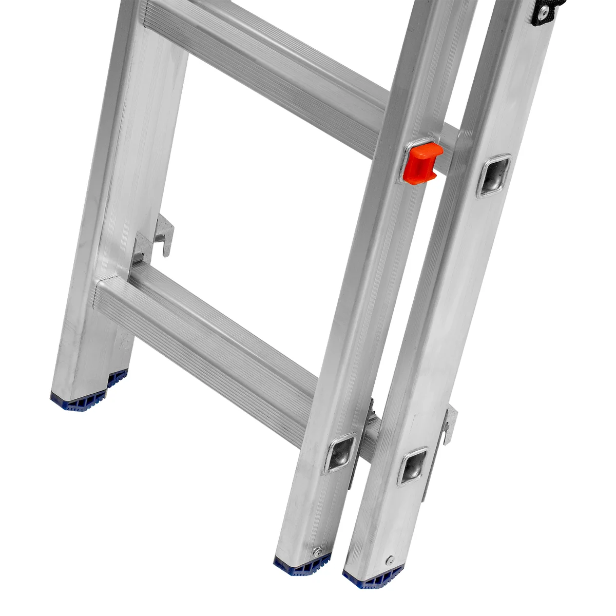 - Многофункциональность — лестница может использоваться в 3 различных вариациях — в качестве стремянки (с двумя расставленными и одной выдвинутой вверх секцией), двухсторонней стремянки (две секции расставлены, третья демонтирована) и приставной лестницы.
