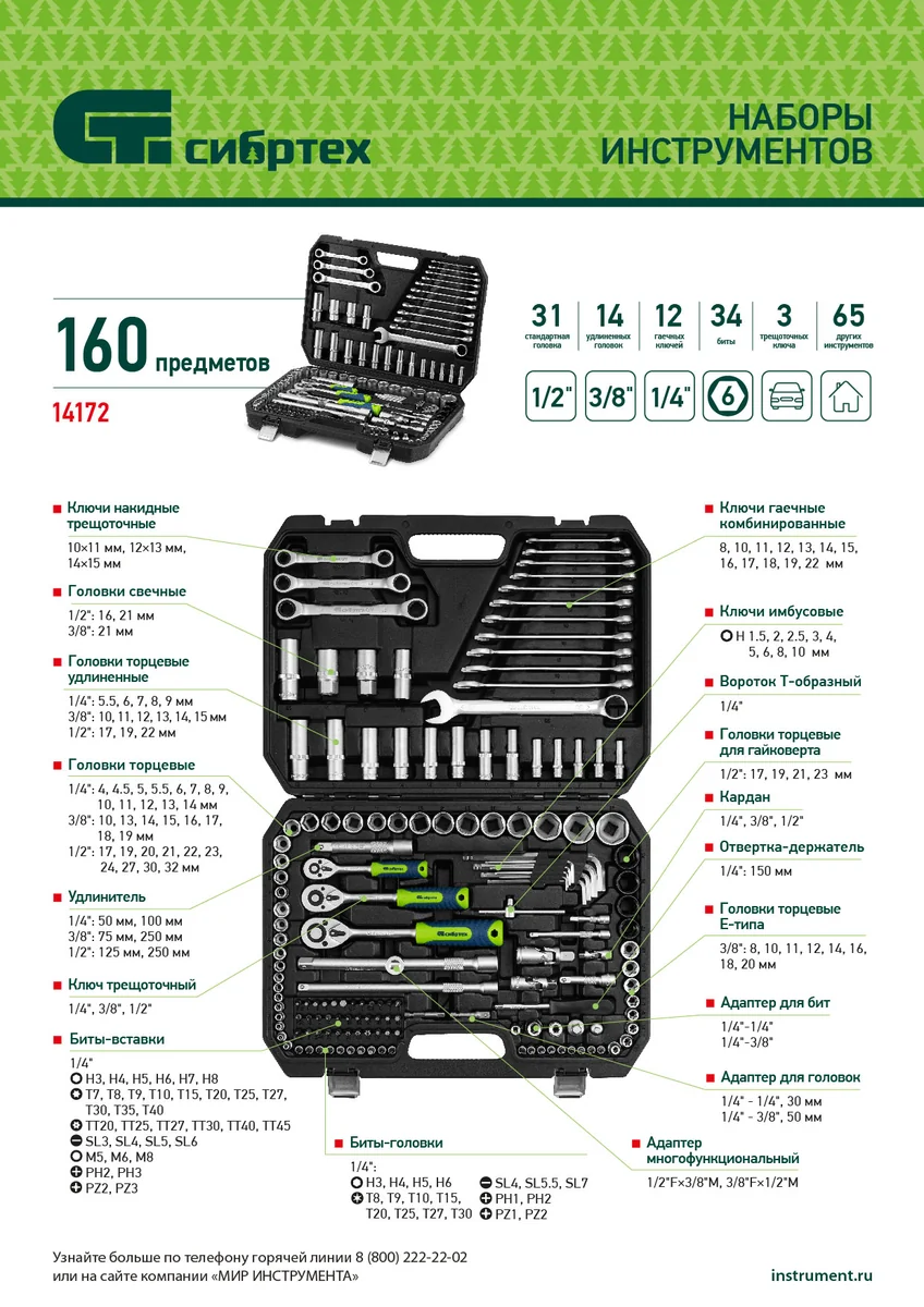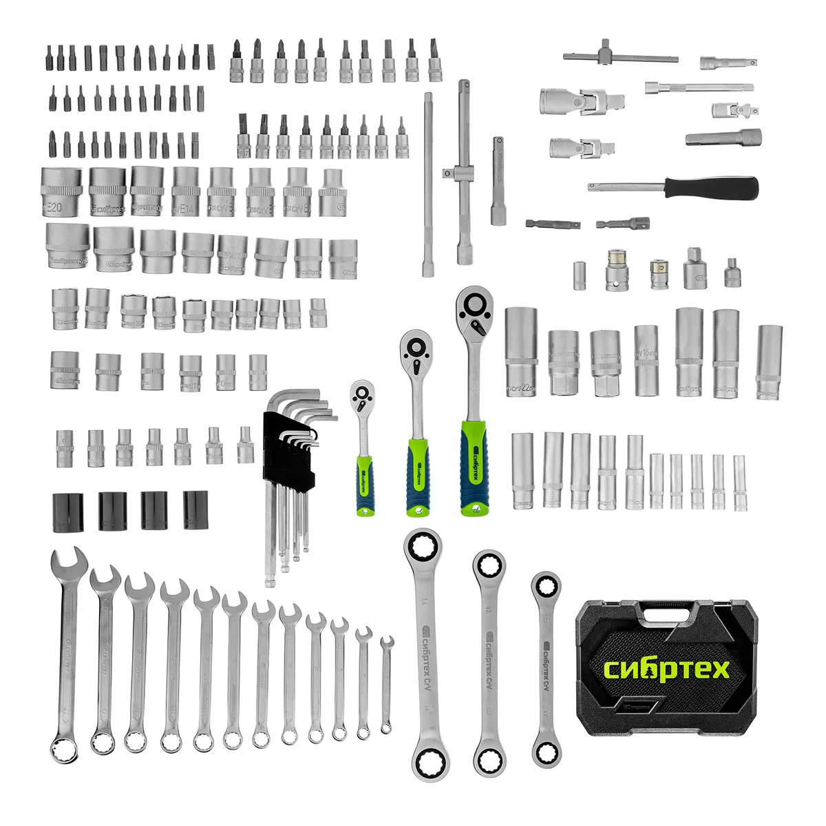 Набор инструментов Сибртех 14172 упакован в пластиковый кейс и состоит из 160 предметов с присоединительным размером 1/2", 3/8", 1/4", предназначенных для монтажа и демонтажа резьбового крепежа с разными типами шлицев. В комплект поставки входят карданы, удлинители и переходники, облегчающие работу в труднодоступных местах. Набор используется для ремонта автомобилей, а также будет полезен в быту.