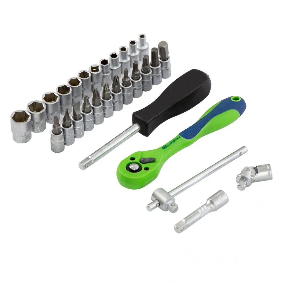 Набор инструментов Сибртех 13523, 1/4 дюйма, в пластиковом кейсе, состоит из 29 предметов, изготовленных из стали CrV-группы и использующихся для работы с резьбовыми соединениями. В комплекте имеются кардан, удлинитель и вороток, упрощающие работу в труднодоступных местах. Набор будет полезен автолюбителям и домашним мастерам.