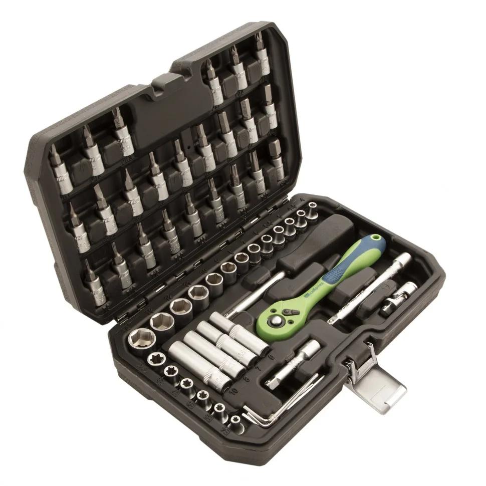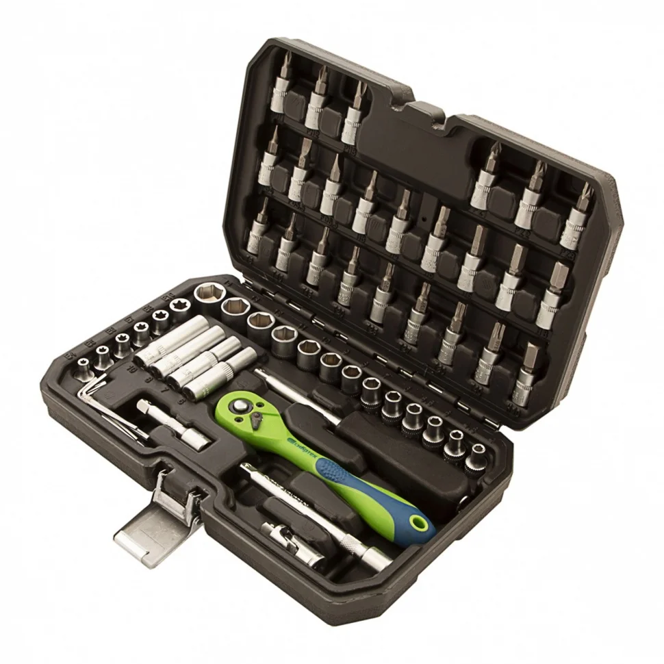 Набор инструментов Сибртех 13525, 1/4 дюйма, в пластиковом кейсе, состоит из 56 предметов, изготовленных из стали CrV-группы и предназначенных для закручивания и откручивания резьбовых крепежей. Имеющиеся в комплекте 2 удлинителя и кардан облегчают работу в труднодоступных местах. Набор будет полезен для ремонта автомобиля в гараже, пригодится также и в быту.