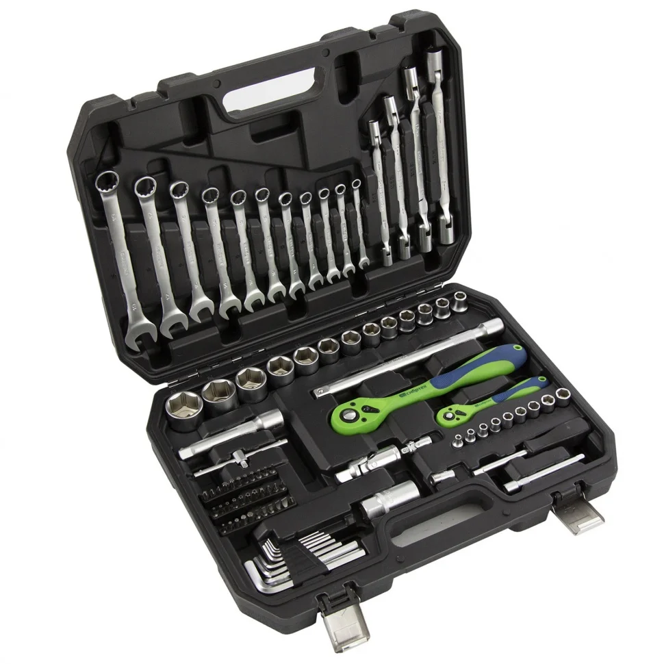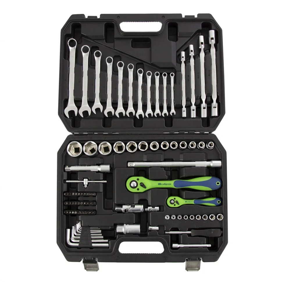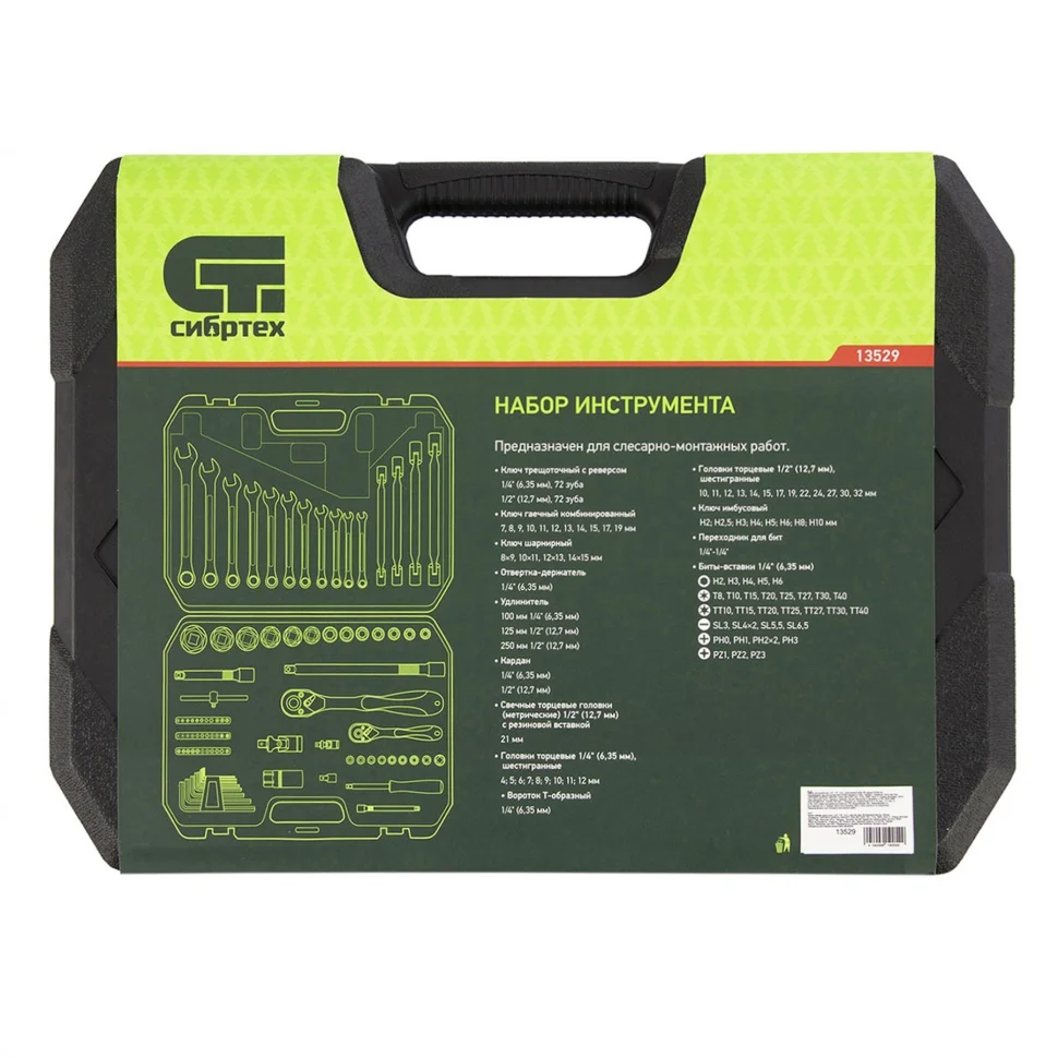 Набор инструментов Сибртех 13529, 1/2 и 1/4 дюйма, упакован в пластиковый кейс и состоит из 89 предметов из стали CrV-группы, предназначенных для монтажа и демонтажа резьбовых крепежей с разными типами шлицев. В комплект входят карданы, удлинители и шарнирные ключи, облегчающие работу в труднодоступных местах. Набор используется для ремонта автомобилей, а также полезен в быту.
