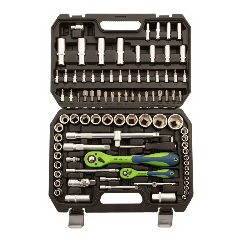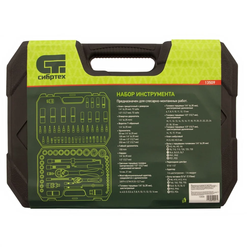 Набор инструментов Сибртех 13509 упакован в пластиковый кейс и состоит из 94 предметов из стали CrV-группы, с присоединительными квадратами 1/2"" и 1/4"". Инструменты предназначены для монтажа и демонтажа резьбового крепежа с разными типами шлицев. В комплект входят карданы, удлинители и переходники, облегчающие работу в труднодоступных местах. Набор используется для ремонта автомобилей, а также полезен в быту.