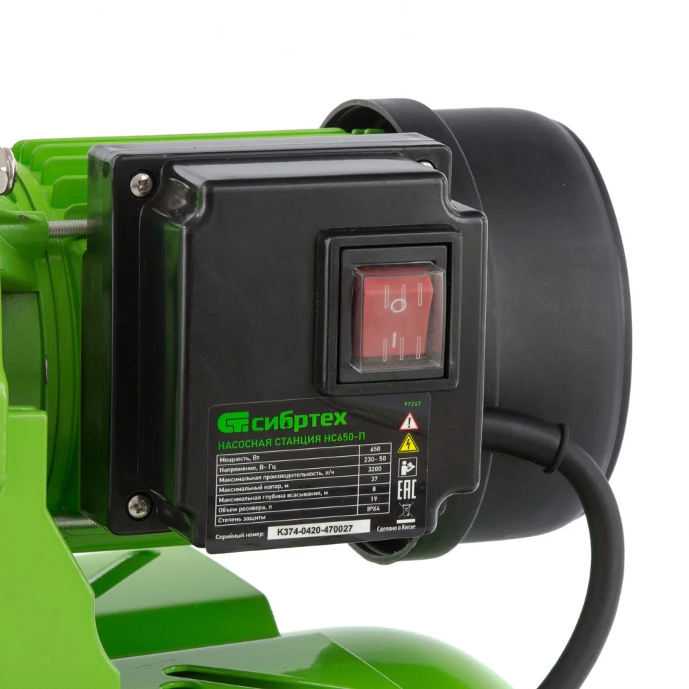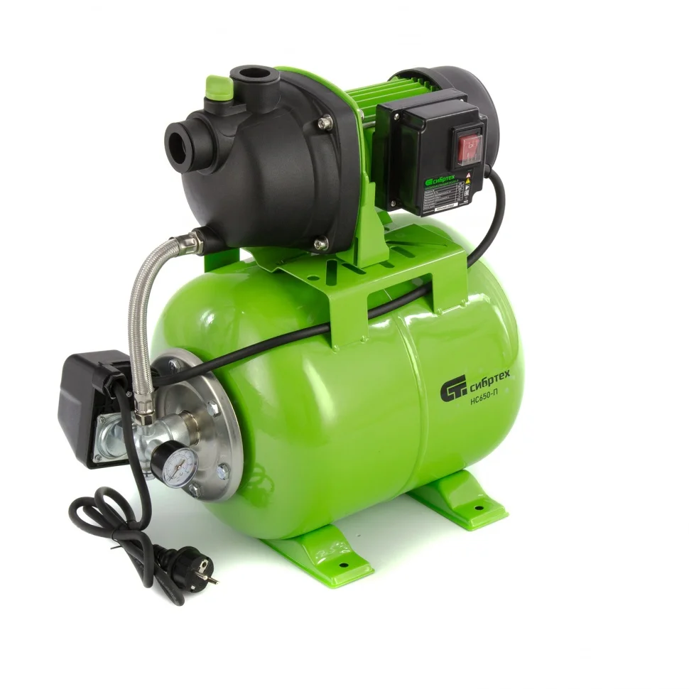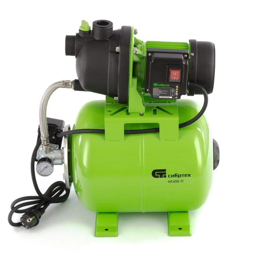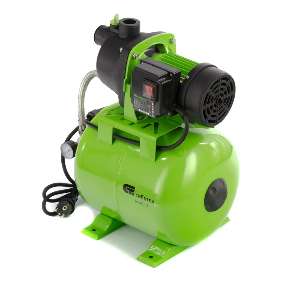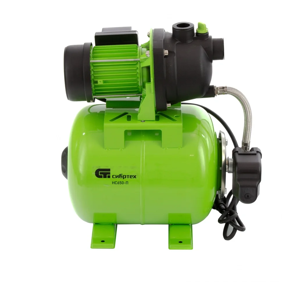 Насосная станция Сибртех НС650-П 97247 мощностью 650 Вт, с ресивером на 19 л, обеспечивает напор воды до 37 м и применяется для организации водоснабжения в частных домах и дачных коттеджах. Также подходит для стабилизации напора воды в квартирах. Надежный электродвигатель на 650 Вт обеспечивает скорость перекачивания до 53 л/мин под давлением до 2,8 бар.;Насосная станция оснащена ресивером, поэтому двигатель включается только после израсходования накопленного запаса воды. Автоматизация рабочего процесса позволяет разумно потреблять как воду, так и электроэнергию.