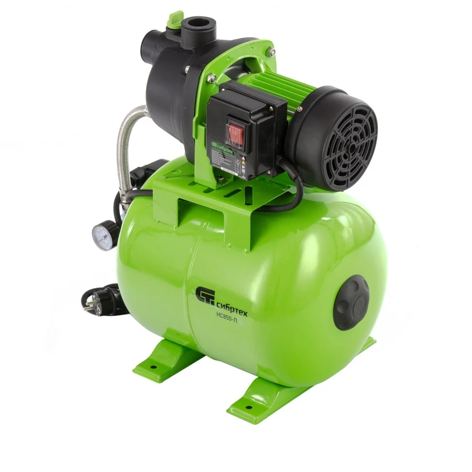 Насосная станция Сибртех НС850-П 97248 мощностью 850 Вт, с ресивером на 19 л, работает со скоростью 3500 л/ч и обеспечивает напор до 42 м. Используется для обеспечения подачи воды в загородных домах, поддержания давления в системе водоснабжения квартир. Однофазный мотор обеспечивает производительность на уровне 58 л/мин под давлением не более 2,8 бар.;Станция работает в автоматическом режиме: накапливает воду в ресивере и включается по мере ее потребления. Подача воды также происходит экономно: она поступает к сантехническому оборудованию и кранам только в момент их включения. Пробка заливной горловины легко откручивается, поэтому подготовить насосную станцию к первому запуску не составит труда.