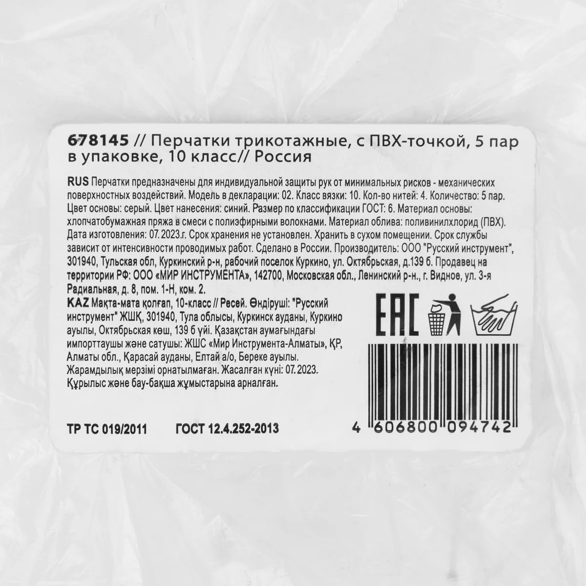 Перчатки трикотажные, с ПВХ точкой, 5 пар в упаковке, 10 класс Россия 678145