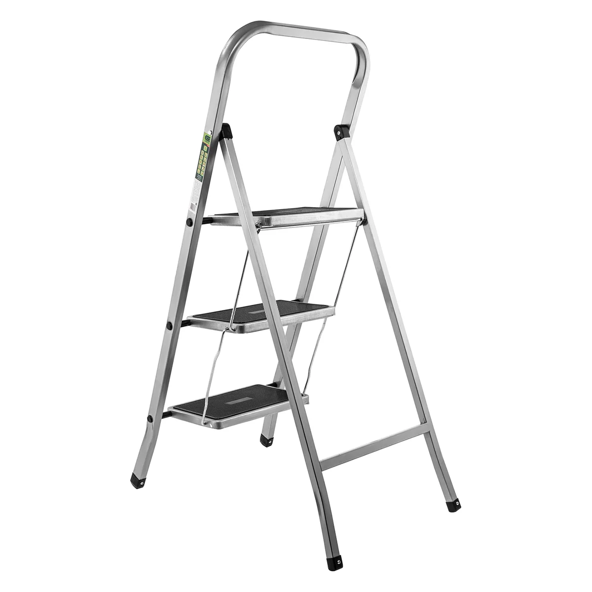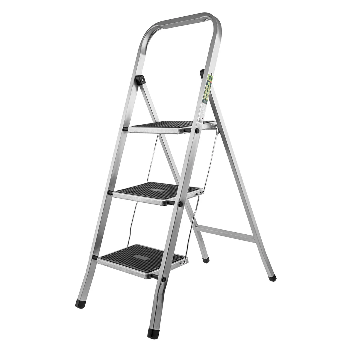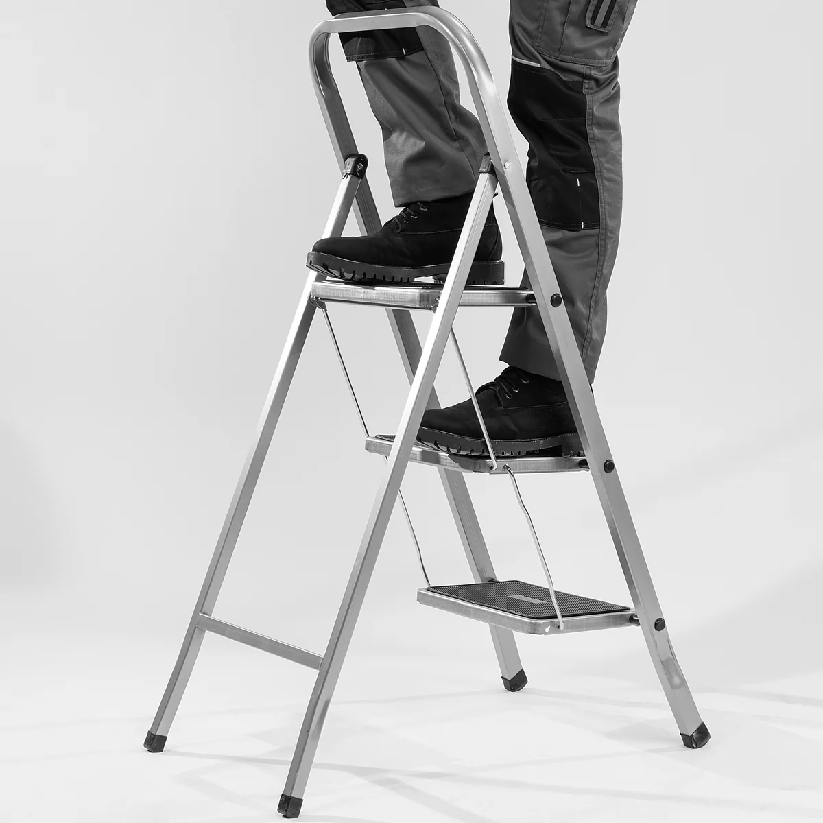 - Прочность — рама и ступени изготовлены из стали, поэтому стремянка выдерживает нагрузку 120 кг.