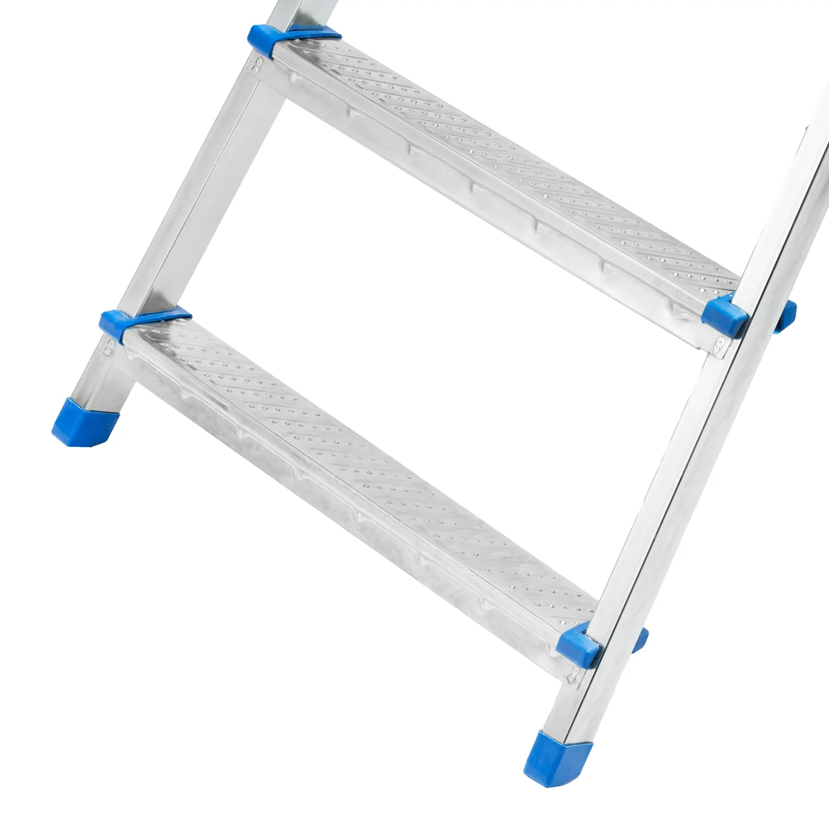 Стальная оцинкованная стремянка Сибртех 97839 с 7 ступенями позволяет повесить полку, картину или шкафчик, достать нужный предмет и решить другие задачи, для которых требуется доступ к предметам на высоте. Рама и ступени из стального профиля выдерживают вес до 120 кг. Расстояние от опорной поверхности до площадки составляет 143,5 см, при среднем росте пользователя 170 см рабочая высота лестницы — 343,5 см. Необходимо соблюдать технику безопасности: размещать стремянку только на ровной плоскости и не использовать ее для работы с дрелью, шуруповертом и другим электроинструментом.