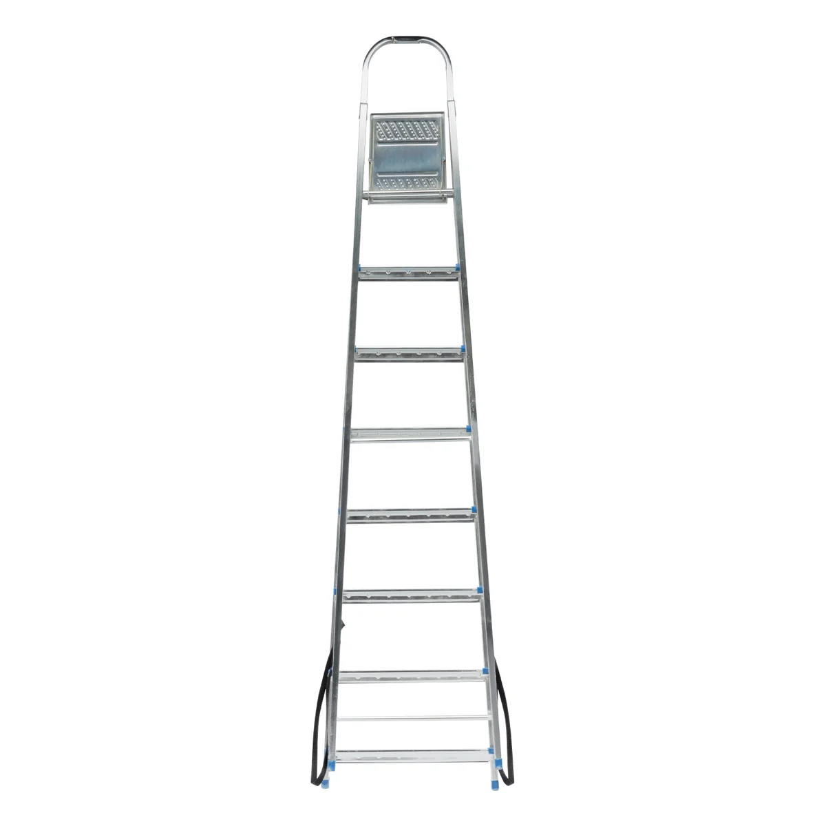 - Надежность — рама изготовлена из профилированной стали, стальная верхняя площадка с зацепами прочно фиксирует стремянку в рабочем положении, страховочные ленты придают дополнительную прочность конструкции.