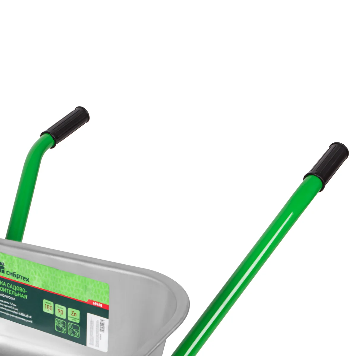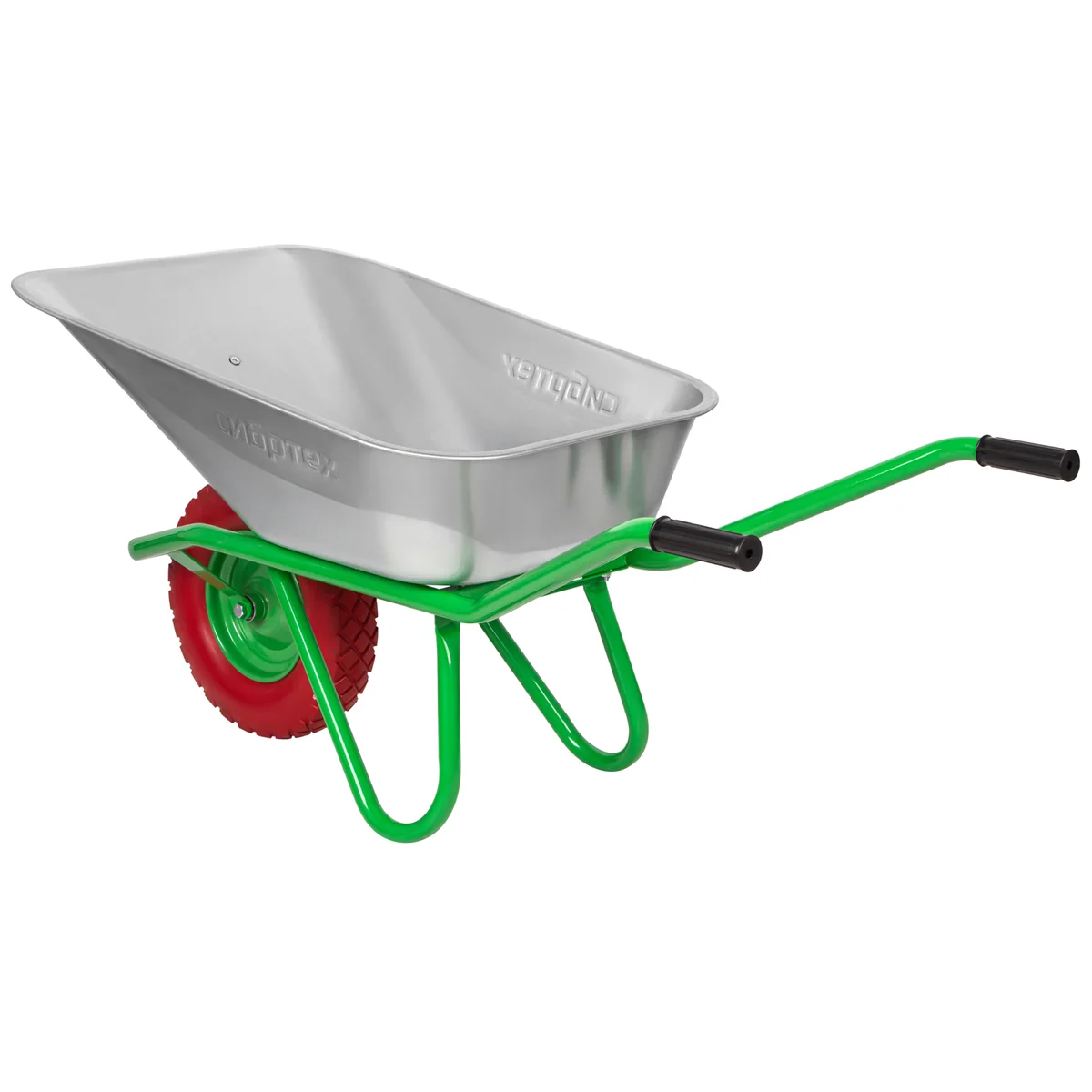 Садово-строительная тачка Сибртех 68968 с PU колесом, грузоподъемностью 180 кг и объемом кузова 90 л, используется для перемещения грунта, песка, мусора, веток или строительных смесей. Будет полезна на строительной площадке и дачном участке. Благодаря одному колесу тачка очень маневренна, ее удобно разворачивать и провозить в узких местах.