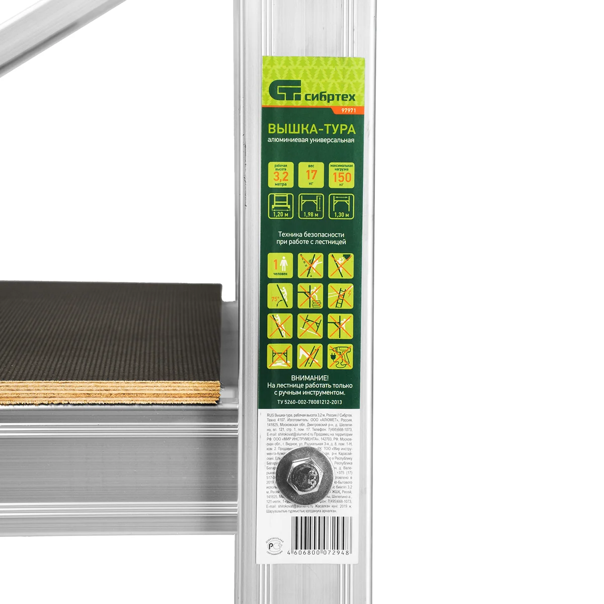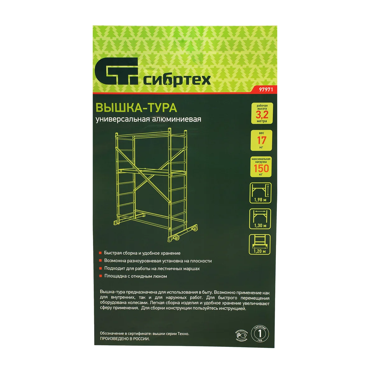 Вышка-тура 97971 используется для проведения строительных, ремонтных, отделочных и монтажных работ на высоте до 3,2 м. Грузоподъемность конструкции 150 кг — на площадке мастер может расположиться сам и разместить необходимые инструменты и материалы. Вышка быстро собирается и устанавливается, а благодаря колесам ее легко можно переместить в нужное место.