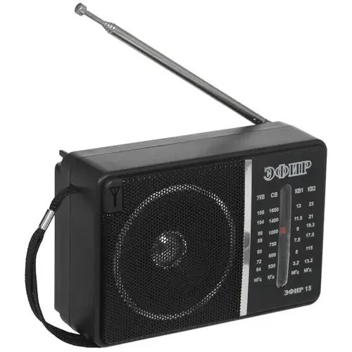 Компактный радиоприемник Эфир 15, представленный в традиционном черном цвете корпуса, имеет все необходимое для уверенного приема радиосигнала в диапазонах FM (64 МГц - 108 МГц), AM (530 кГц - 1600 кГц), КВ1\КВ2 (3,2 - 23 МГц). Устройство транслирует звук в моно-формате, для чего в его конструкции имеется один динамик с выходной мощностью 8 Вт. Выбор частоты радиовещания осуществляется при помощи удобного поворотного переключателя. Уверенный прием радиочастот гарантирует телескопическая антенна. Удобству транспортировки радиоприемника способствует шнурок.