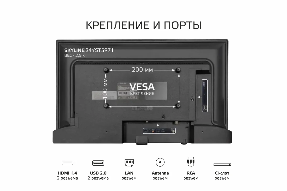 Компактный SMART-телевизор с HD Ready разрешением Skyline 24YST5970 – идеальное решение для небольших помещений. Здесь представлены все необходимые функции от управления питанием подключённых приставок (HDMI CEC) и записи эфира (TimeShift и PVR) до возможности установки APK-приложений и встроенного тюнера для всех видов телевидения: спутниковое, кабельное и цифровое эфирное (DVB-T/T2). Вы получаете высокое качество картинки даже при плохом входящем сигнале – благодаря функции цифровой фильтрации шума 3DNR. Подключение к сети по Wi-Fi или «проводу» (LAN). Встроенный плеер справляется со всеми популярными форматами файлов.
