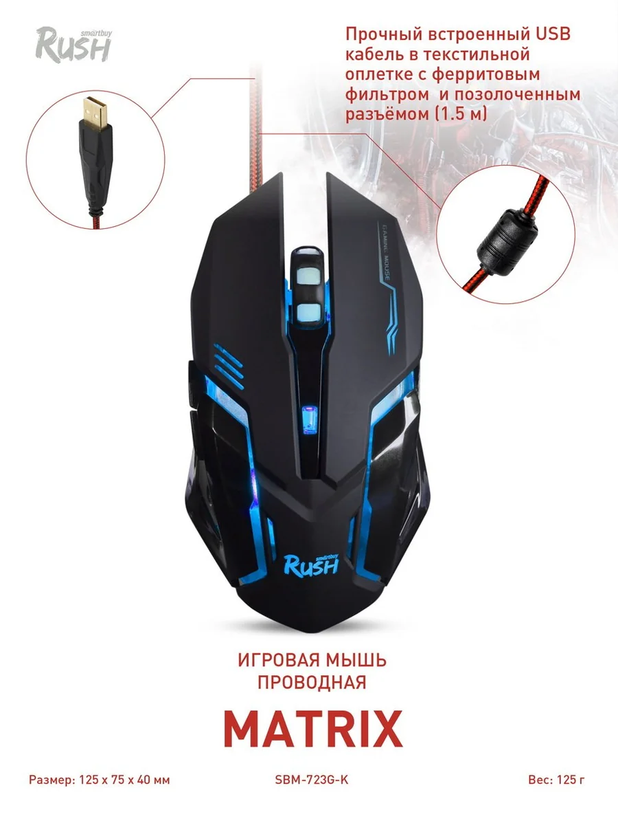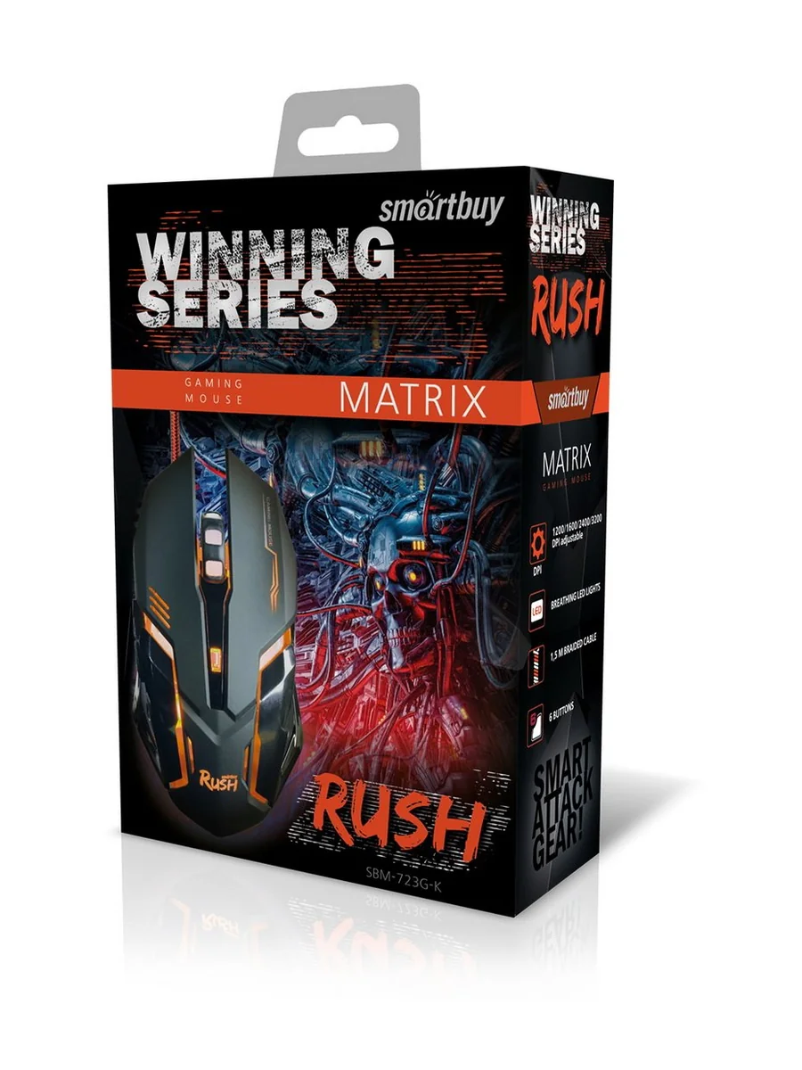 Игровая мышь Smartbuy Rush MATRIX специально разработана для настоящих геймеров. Удобство управления игровой мышью выходит на новый уровень! Быстрый оптический сенсор обеспечивает молниеносную обратную реакцию совершенных движений. 4 уровня DPI на выбор 1200/1600/2400/3200. Благодаря удобному захвату использовать мышь можно длительное время за одну сессию, а тканевый кабель также не создаёт помех при скольжении. Встроенная металлическая пластина на нижней части мыши создаёт идеальный баланс как при медленных, так и при резких движениях.