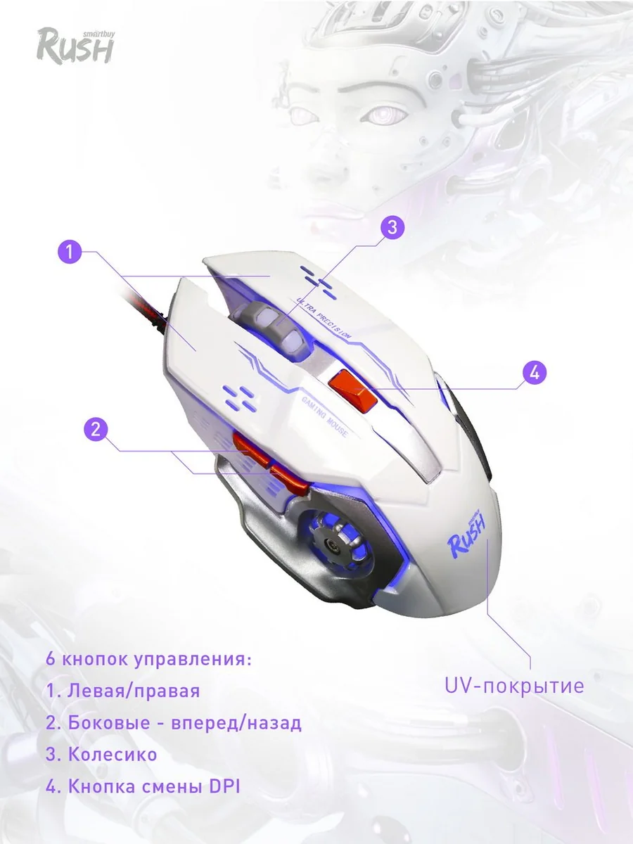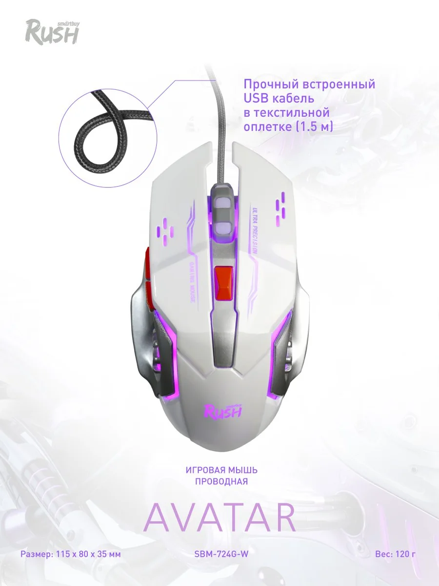 Игровая мышь Avatar специально разработана для настоящих геймеров. Её формы и эргономика клавиш не оставит равнодушным даже самого опытного геймера. Приятная LED подсветка имеет мягкое свечение, а кнопка выбора расширения сенсора с ходу позволит выбрать подходящую настройку. Модель имеет 4 пресета разрешения сенсора DPI - 1200/1600/2400/3200. Корпус выполнен из качественного глянцевого UV покрытия, которое наделено хорошими износостойкими показателями. Встроенная металлическая пластина создаёт идеальный баланс как при медленных, так и при резких движениях. Smartbuy Rush AVATAR это прекрасный выбор для тех, кто хочет быть на игровой высоте!