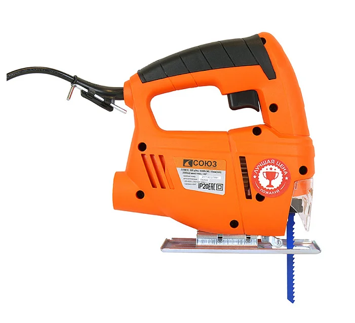 СОЮЗ ЛБС-4050 – компактный и практичный электрический лобзик для бытового использования. Инструмент характеризуется небольшими габаритными размерами, малым весом и выверенной эргономикой, благодаря чему отлично контролируется даже одной рукой. Модель оснащена 500 Вт электромотором и обладает режущей способностью в древесине до 55 мм, в металле до 6 мм. Для выполнения пропилов под углом опорная платформа лобзика имеет возможность регулировки наклона до 45 градусов. Изменение частоты ходов штока происходит посредством степени нажатия на пусковую кнопку, что особенно удобно при выполнении криволинейных пропилов. Для комфорта при длительной работе предусмотрена фиксация пусковой клавиши. При необходимости возможно подключение к лобзику строительного пылесоса. В штатную комплектацию входят пильное полотно, шестигранный ключ, а также запасные угольные щетки.