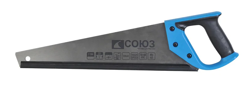 Обрезиненная антискользящая поверхность рукоятки; Каленый 2D зуб; 7 TPI; Высокая скорость пиления; Ровный рез;