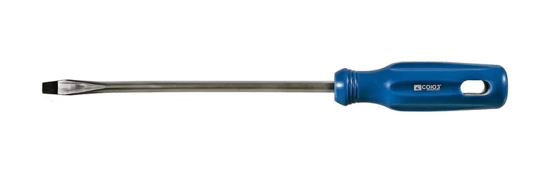 Эргономичная рукоятка из ПВХ с удобным отверстием для подвеса. Рабочая часть отвертки выполнена из высоколегированной хромованадиевой инструментальной стали и имеет высокую твердость и прочность, что определяет длительный срок службы инструмента.
