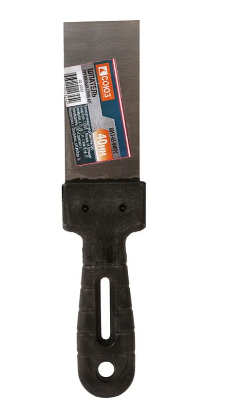 Шпатели с пластиковой ручкой СОЮЗ используются для нанесения и разравнивания шпатлёвки, очистки поверхностей от старой замазки, обоев, краски, выполнения мелких отделочных работ, например, замазывания меж плиточных швов или затирки небольших поверхностей. Инструмент прослужит долгие годы без поломок, подходит для частого использования. Для надежности лезвие выполнено из углеродистой пружинной стали. Для удобства хранения у пластиковой ручки имеется отверстие для подвеса.