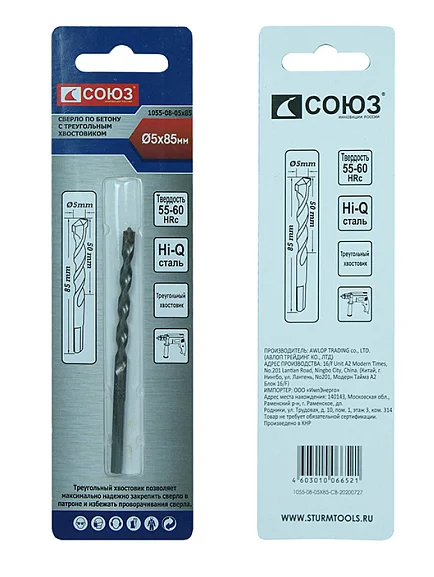 Сверло по бетону, 5x85 , твердосплавная напайка BK8, треугольный хвостовик, Союз 1055-08-05x85