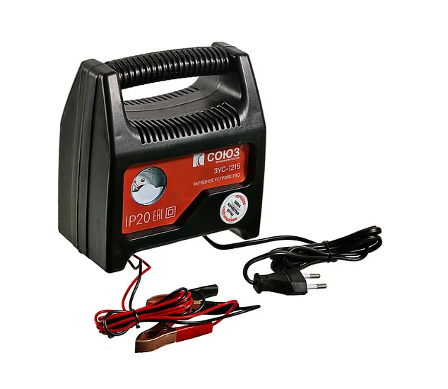 СОЮЗ ЗУС-1215 — портативное трансформаторное зарядное устройство. Предназначено для зарядки свинцово-кислотных аккумуляторных батарей напряжением 12 В и емкостью от 35 до 80 Ач. Модель выполнена в компактном пластиковом корпусе — благодаря своим минимальным габаритам очень удобна в хранении и транспортировке. Устройство предельно простое в эксплуатации и не требует специальных навыков — пользователю достаточно лишь подключить провода с зажимными клеммами к аккумулятору соблюдая полярность и включить прибор в сеть. Контролировать процесс зарядки помогает встроенный амперметр. Ток зарядки СОЮЗ ЗУС-1215 составляет 5 А. Для обеспечения безопасности пользователя в случае любых внештатных ситуаций модель оснащена необходимым комплексом защиты: от перегрева, от короткого замыкания, от неверной полярности подключения.