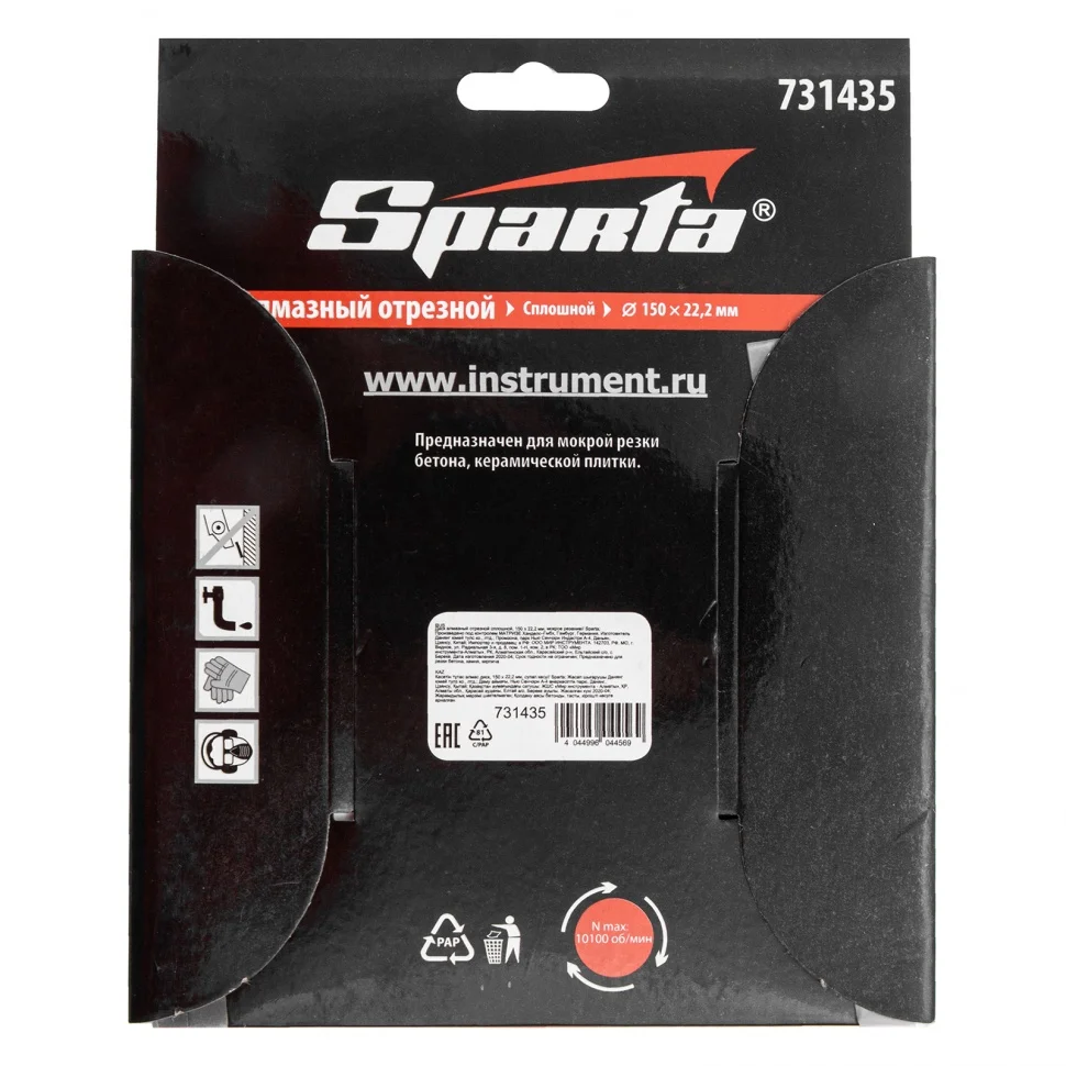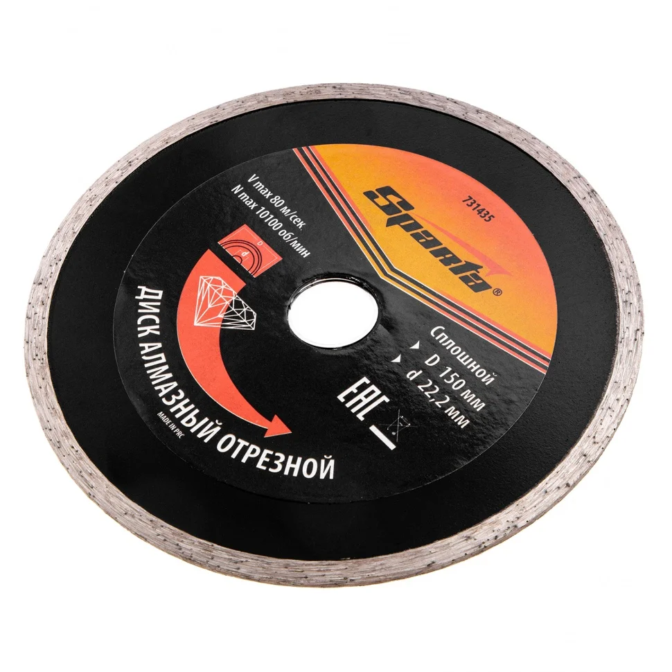 Отрезной алмазный диск Sparta 731435, сплошной, 150 х 22,2 мм - расходный инструмент для болгарок и плиткорезов, используемый для мокрого резания. Он позволяет выполнить аккуратный рез по керамике, керамограниту и мрамору в бытовых условиях. Рекомендуется применять с использованием водяного охлаждения.ПреимуществаУстойчивость к нагрузкам - диск изготовлен методом холодного прессования.Сплошная режущая кромка - срез получается чистым, без трещин и сколов.Высокая работоспособность - благодаря связке из металлических компонентов алмазы надежно удерживаются в рабочем слое и новые зерна своевременно раскрываются по мере истирания верхнего слоя.Ширина рабочей части 6 мм - диск оптимально подходит для домашнего применения.Хорошая производительность за счет подачи воды - своевременное удаление шлама и охлаждение диска исключают его поломку.