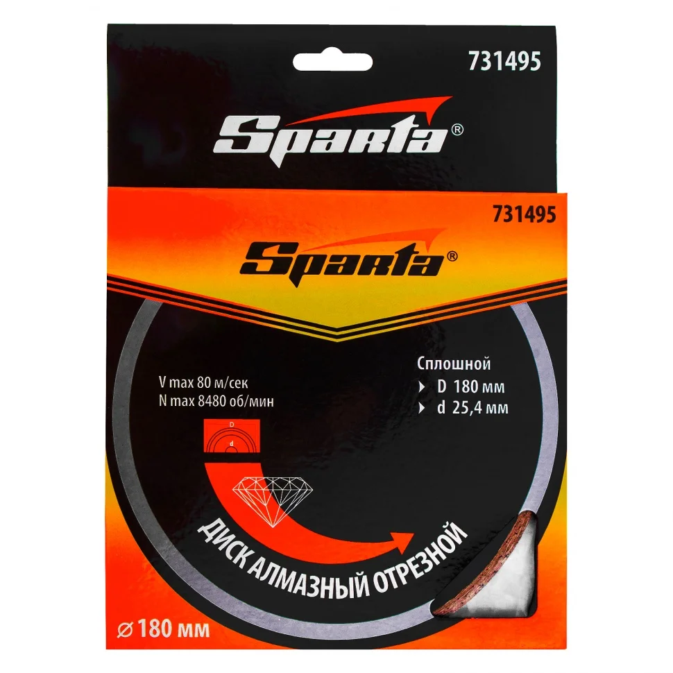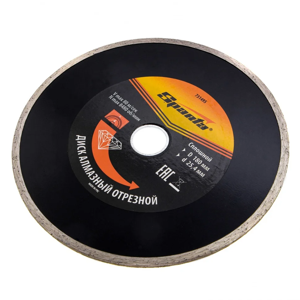 Отрезной алмазный диск Sparta 731495, сплошной, 180 х 25,4 мм - расходный инструмент для болгарок и плиткорезов, используемый для мокрого резания. Он позволяет выполнить аккуратный рез по керамике, керамограниту и мрамору в бытовых условиях. Рекомендуется применять с использованием водяного охлаждения.ПреимуществаУстойчивость к нагрузкам - диск изготовлен методом холодного прессования.Сплошная режущая кромка - срез получается чистым, без трещин и сколов.Высокая работоспособность - благодаря связке из металлических компонентов алмазы надежно удерживаются в рабочем слое и новые зерна своевременно раскрываются по мере истирания верхнего слоя.Ширина рабочей части 6 мм - диск оптимально подходит для домашнего применения.Хорошая производительность за счет подачи воды - своевременное удаление шлама и охлаждение диска исключают его поломку.