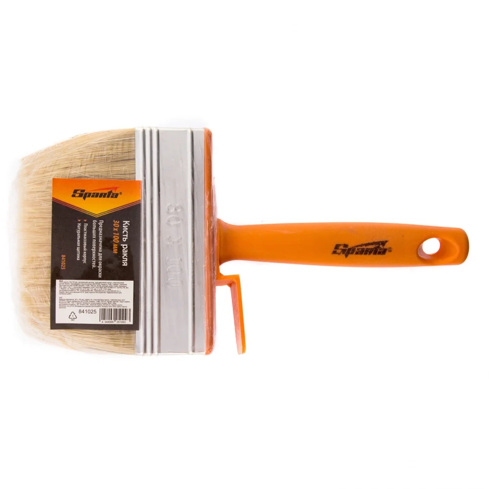 Кисть-ракля Sparta 841025, 30 х 100 мм, с натуральной щетиной, пластмассовыми корпусом и ручкой, используется для малярных работ на участках большой площади, поэтому удобна для обработки стен, потолков и фасадов. Натуральная щетина устойчива к химическому воздействию, поэтому не деформируется и сохраняет упругость при работе с ЛКМ на водной основе, грунтовками, масляными красками и клеящими составами.ПреимуществаРасщепленная на концах щетина обладает повышенной способностью набирать, удерживать и распределять по поверхности лакокрасочные материалы.ЛКМ наносится ровно, так как кисть изготовлена с использованием натуральной щетины двойной выварки.Инструмент отвечает всем требованиям проведения малярных работ и прослужит долго — щетина устойчива к износу, а металлический бандаж имеет антикоррозийное покрытие и не ржавеет при контакте с ЛКМ и водой.Утолщенная рукоятка обеспечивает удобный захват и позволяет долго работать без усталости.Во время перерыва да кисть можно закрепить на краю емкости с краской при помощи приспособления на корпусе.Отверстие для подвешивания позволяет сушить и хранить кисть в вертикальном положении.