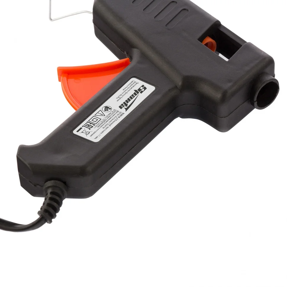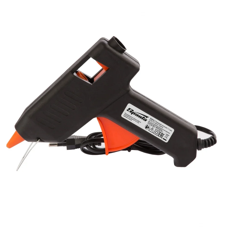 Клеевой пистолет Sparta 930125, 11 мм, 40 Вт, пригодится при проведении несложных бытовых работ: склеивания бумаги, дерева, пластика и других материалов. Он станет незаменимым помощником для частных мастеров, которые занимаются мелким ремонтом, упаковкой, сборкой различных моделей и рукоделием. Время нагрева до максимальной температуры не превышает 5 минут.ПреимуществаКорпус из ударопрочной пластмассы устойчив к механическим повреждениям.Во время работы пистолет можно устанавливать на металлическую скобу-подставку, это повышает удобство эксплуатации.Специальное окошко позволяет отслеживать уровень расхода стержня внутри ствола.Противокапельная система обеспечивает оптимальный расход клея.
